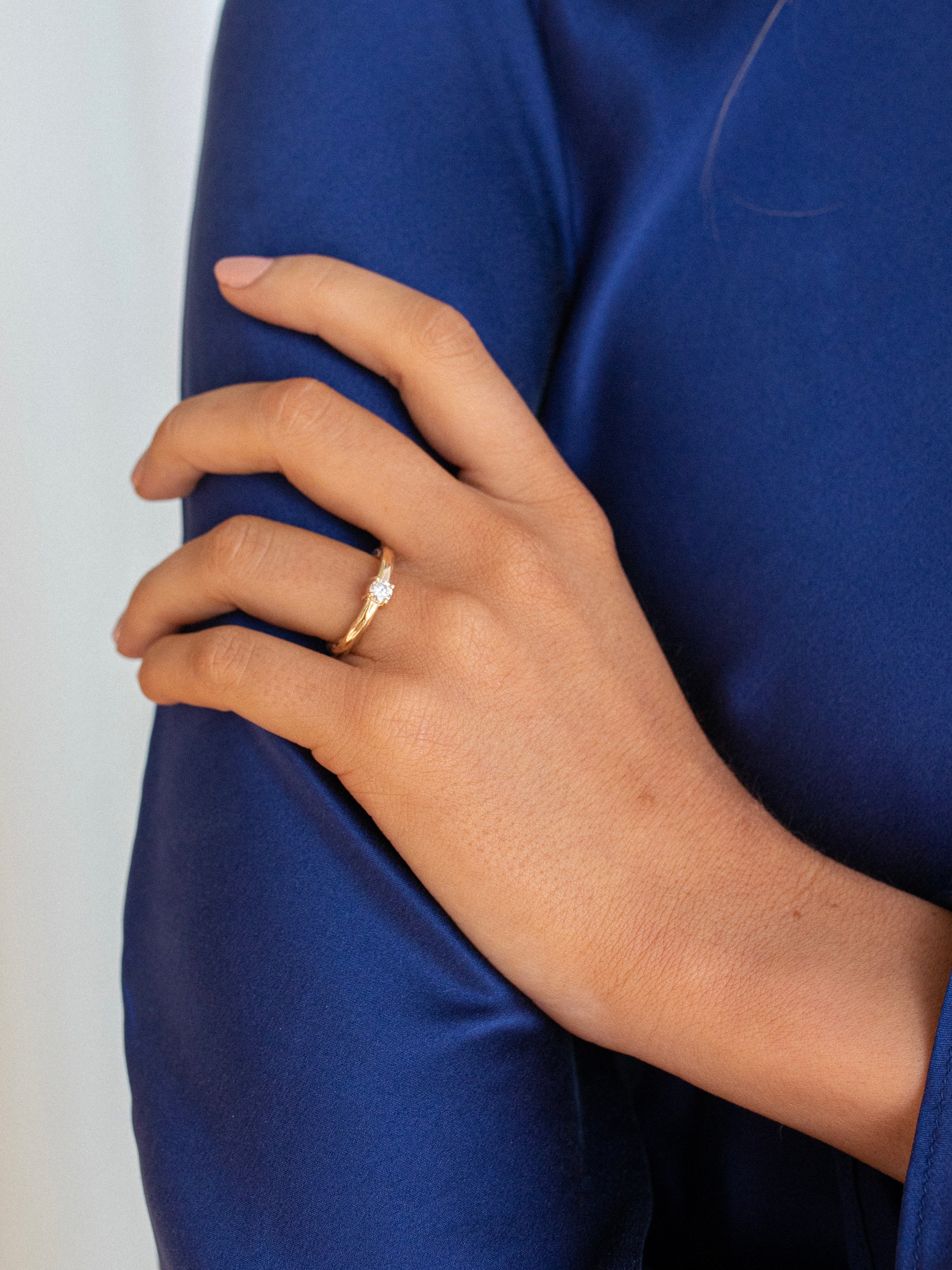 This charming ring showcases a 3mm round moissanite set in a textured band, offering a design that's both dainty and timelessly classic.