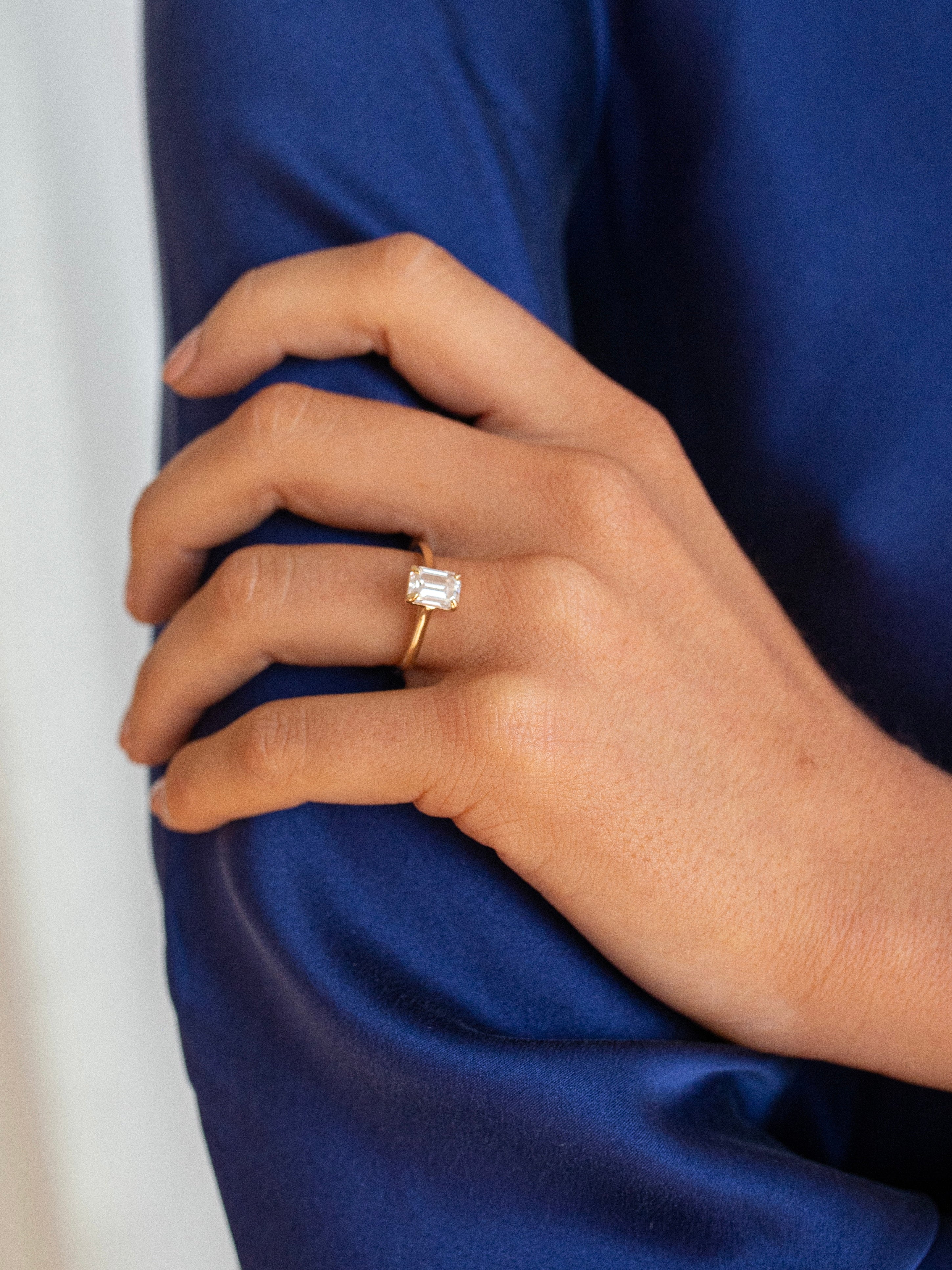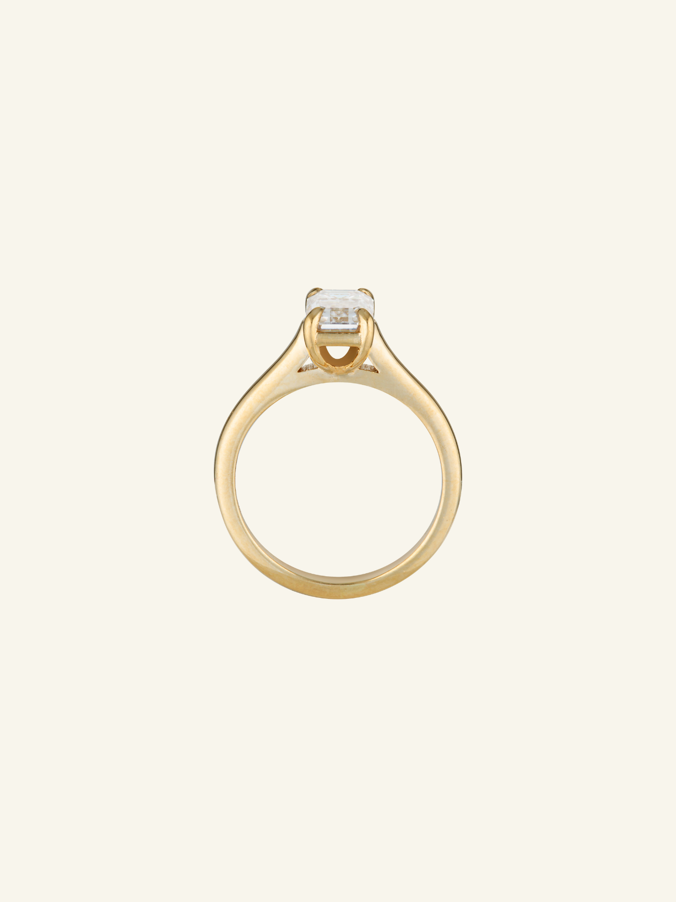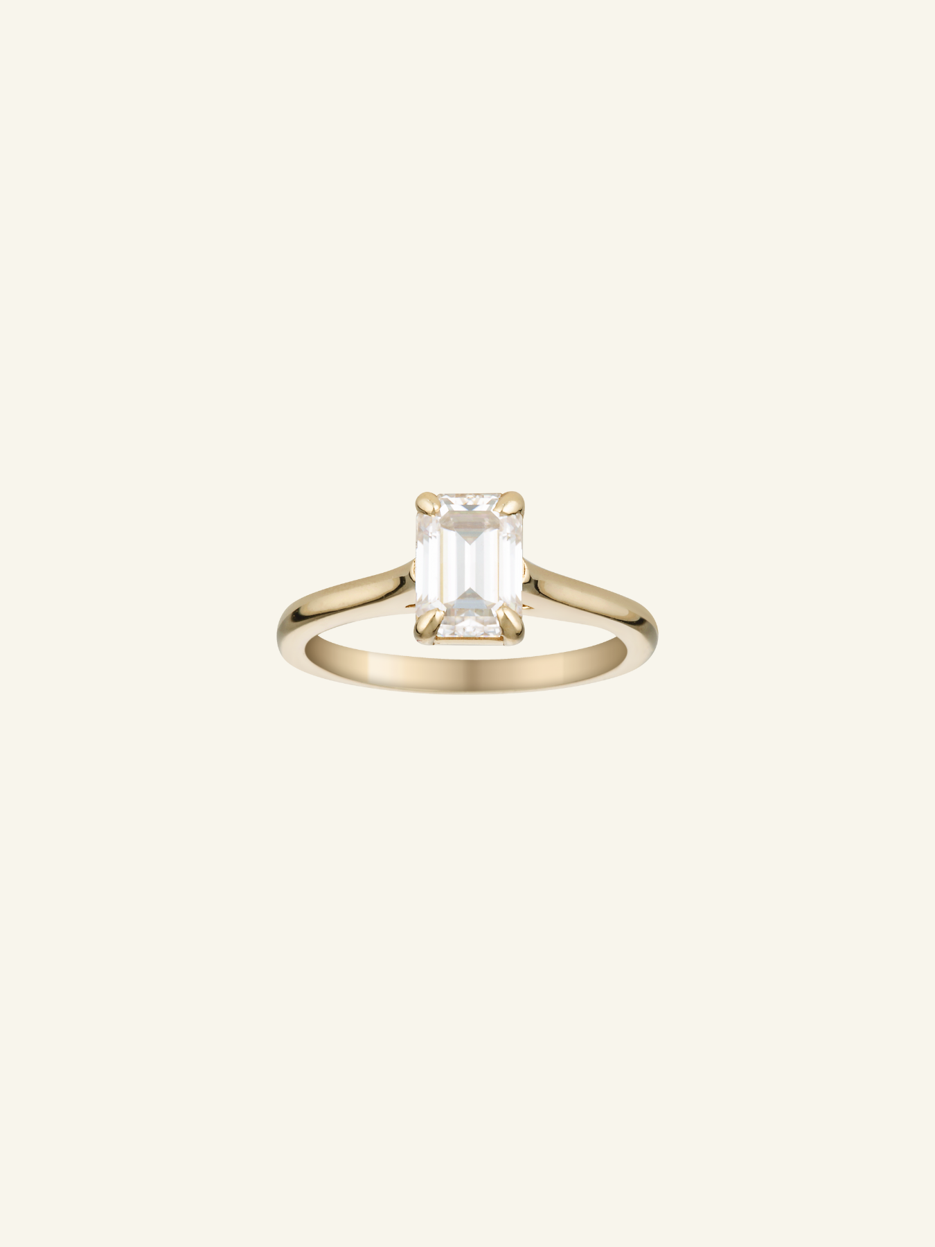 An elegant solitaire engagement ring showcasing an emerald-cut moissanite, secured in a sleek four-talon claw setting.