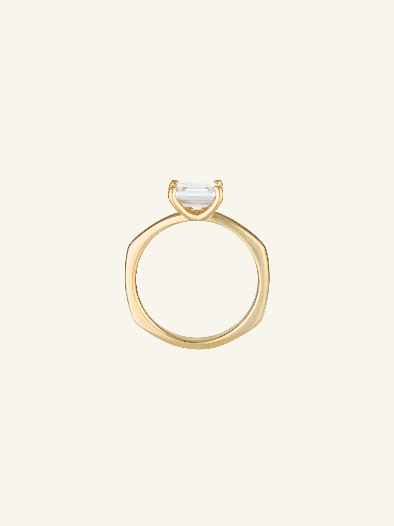 This ring allures a sophisticated charm with its rectangle, emerald-cut moissanite, elegantly prong-set on a delicately edged round band.