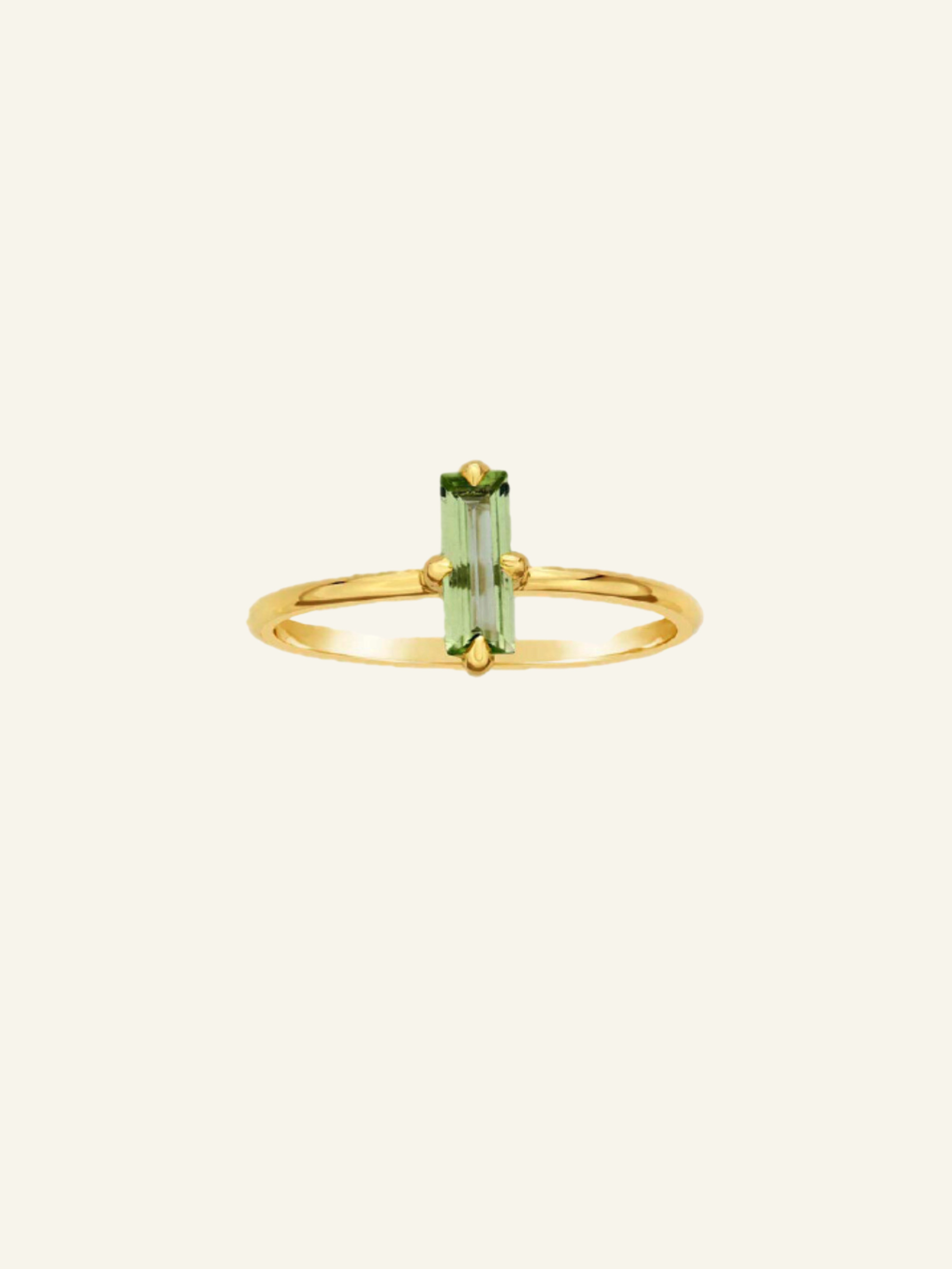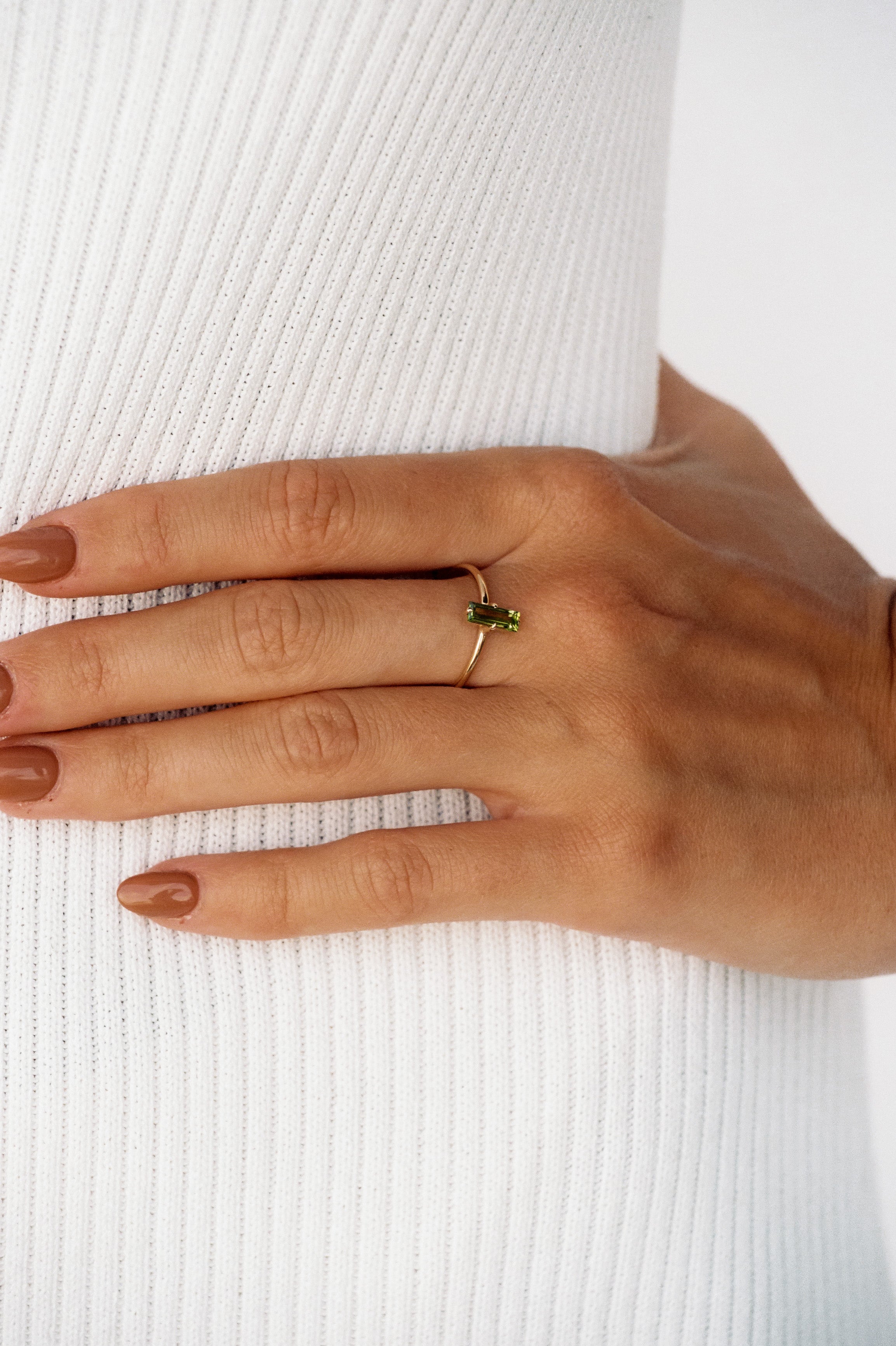 The Solid Gold Baguette Peridot Ring features a baguette peridot stone on a solid band. Ideal for a birthstone ring or a special gift for your loved one.