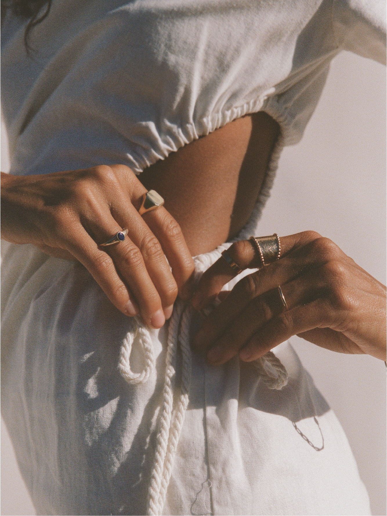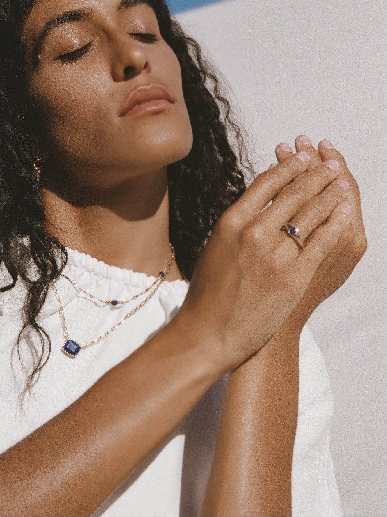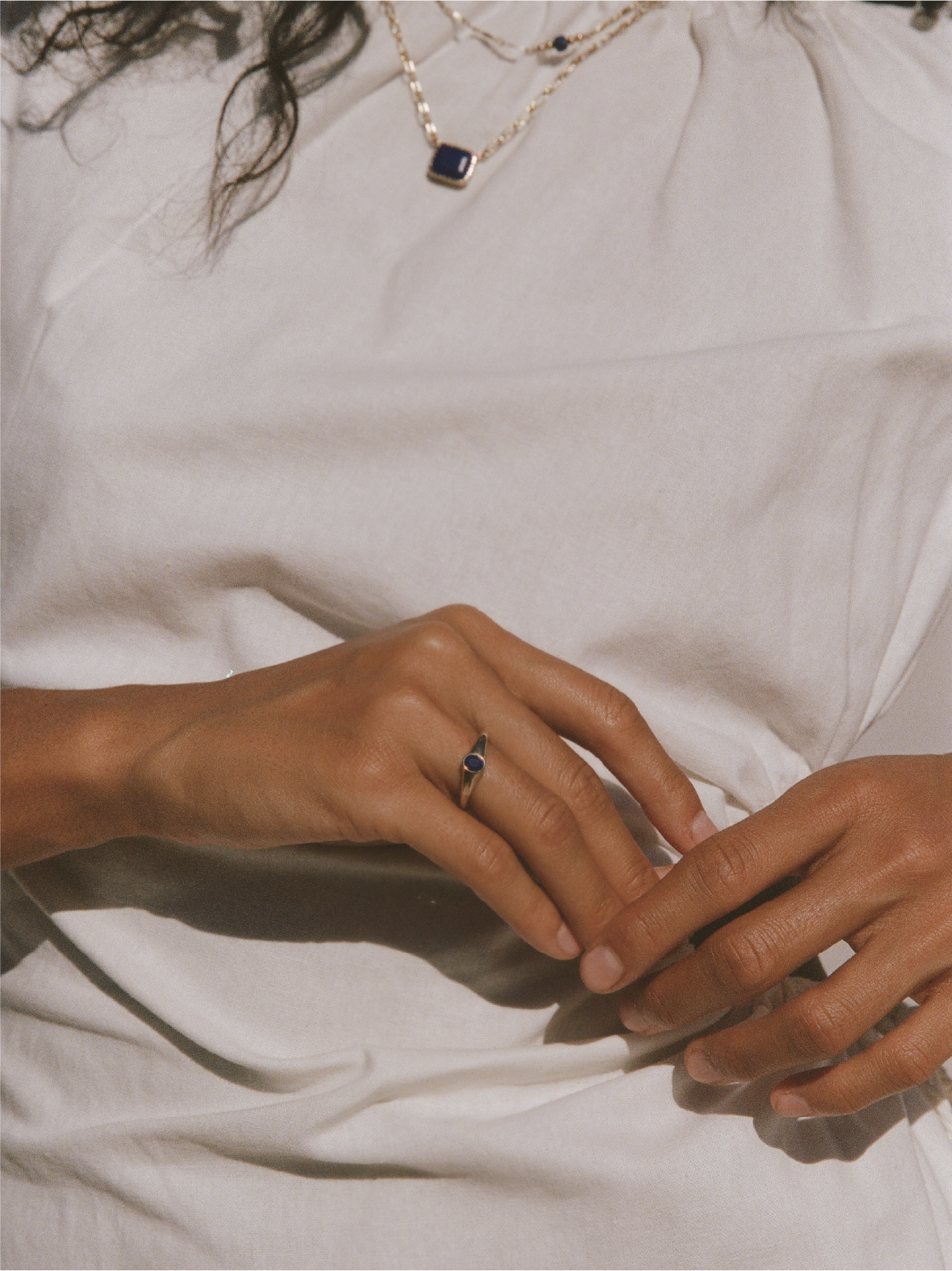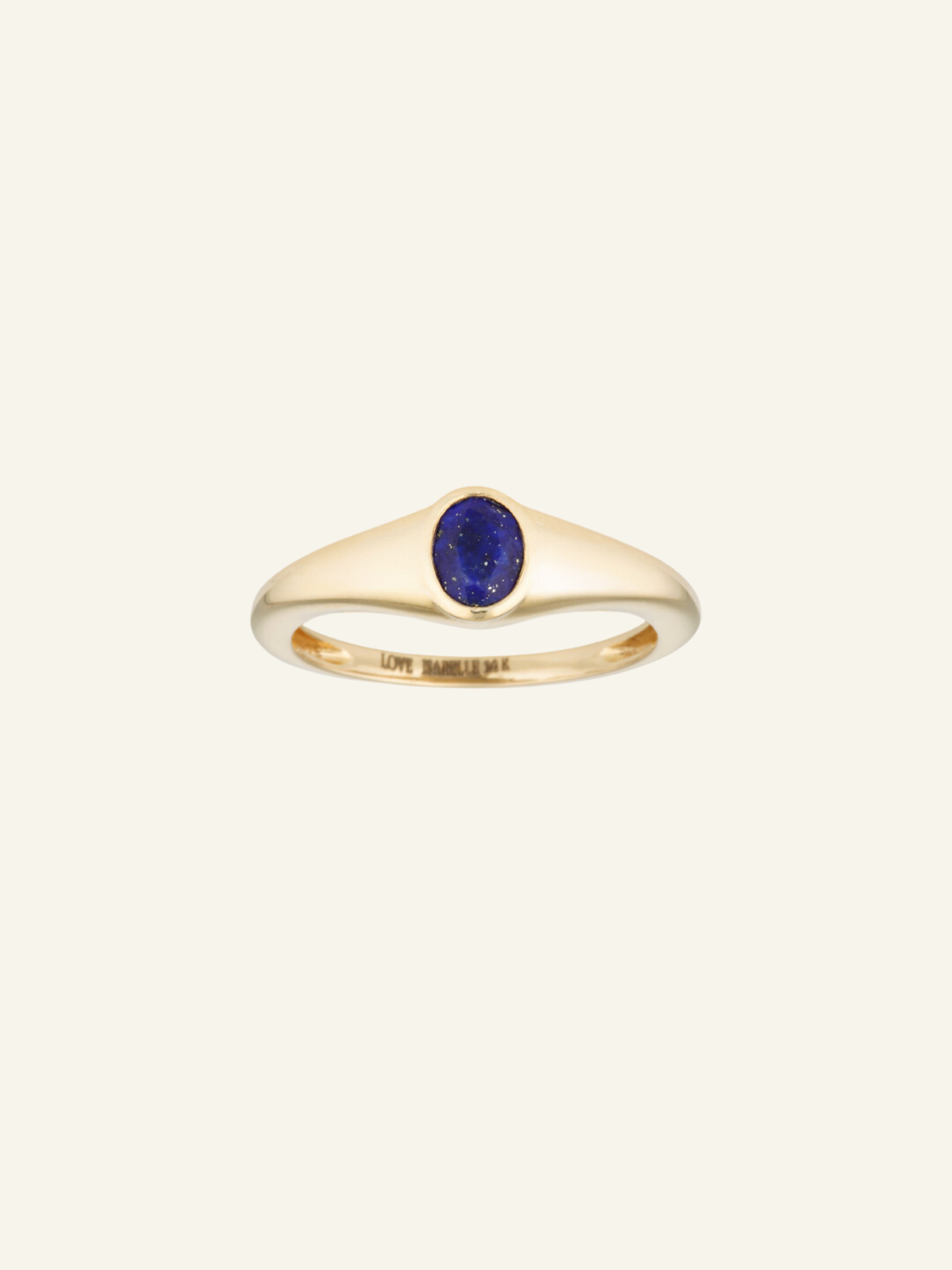 The Solid Gold Lapis Signet Ring features an oval lapis lazuli stone in a shiny band; the classic take on the vintage signet ring.