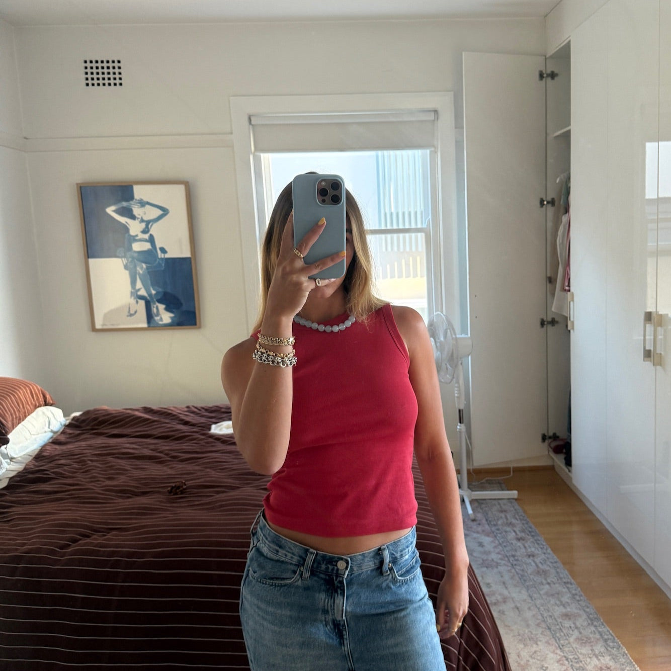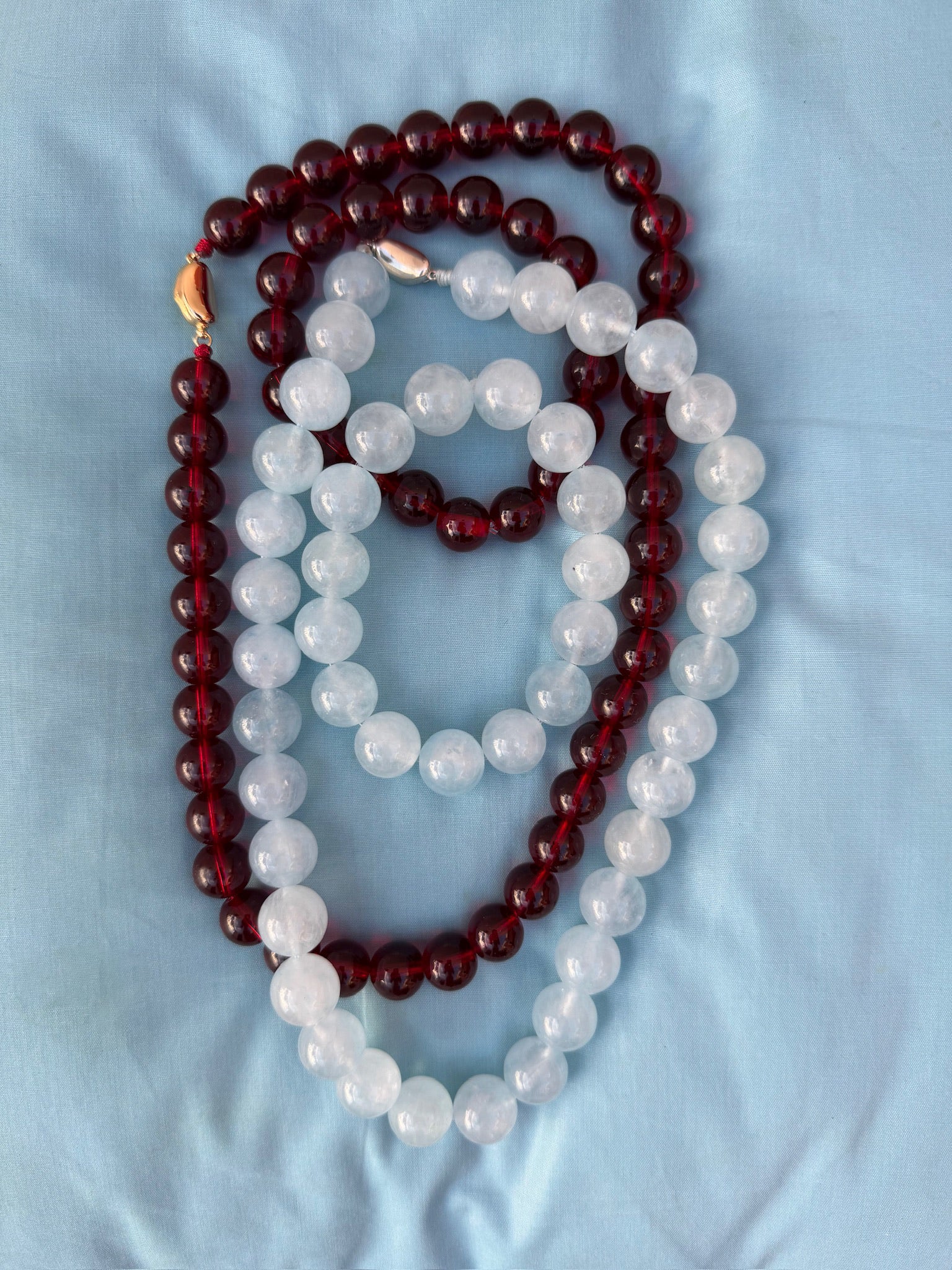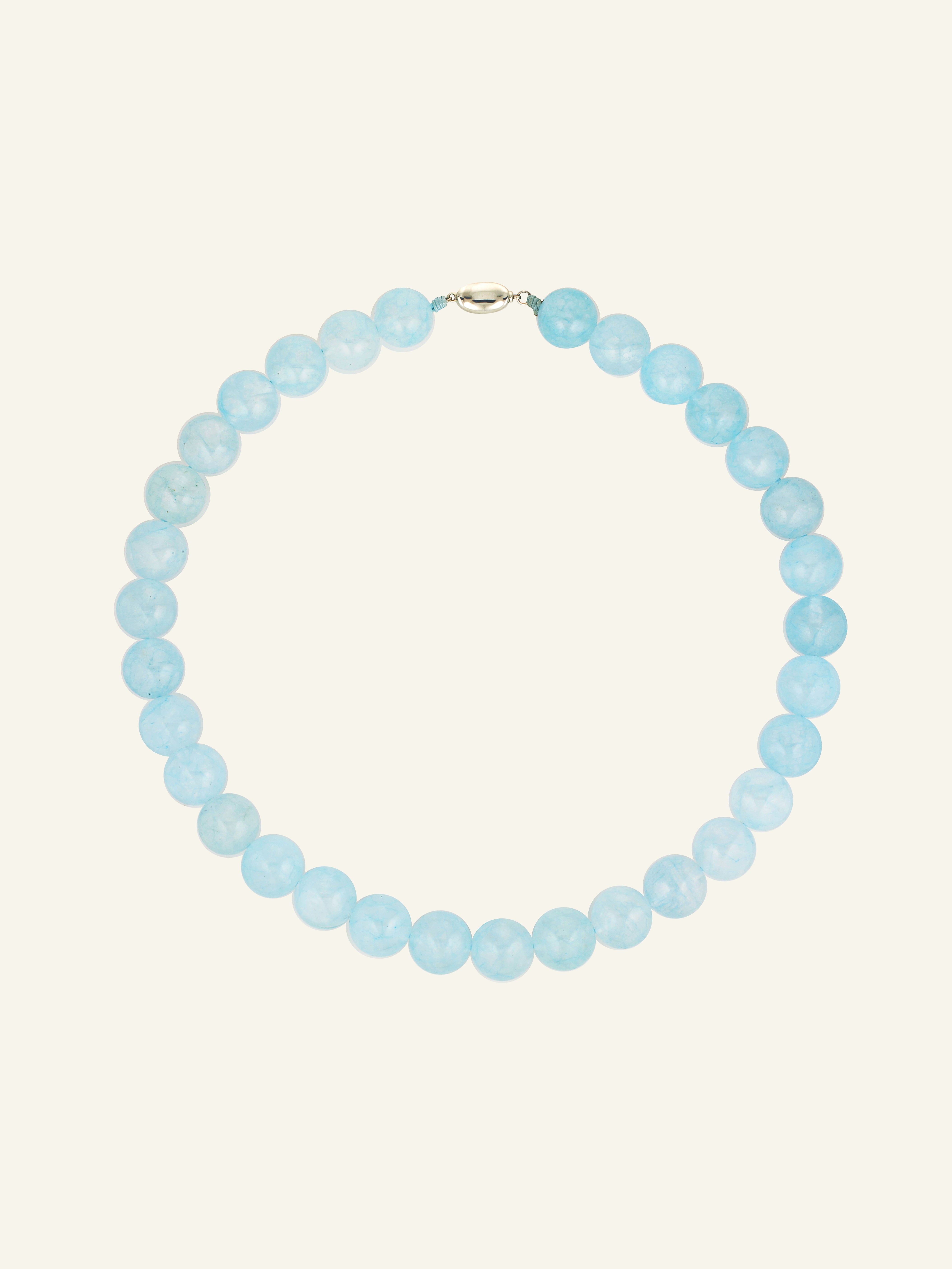 The Elu Aquamarine Necklace features 14mm aquamarine beads and a bean clasp.