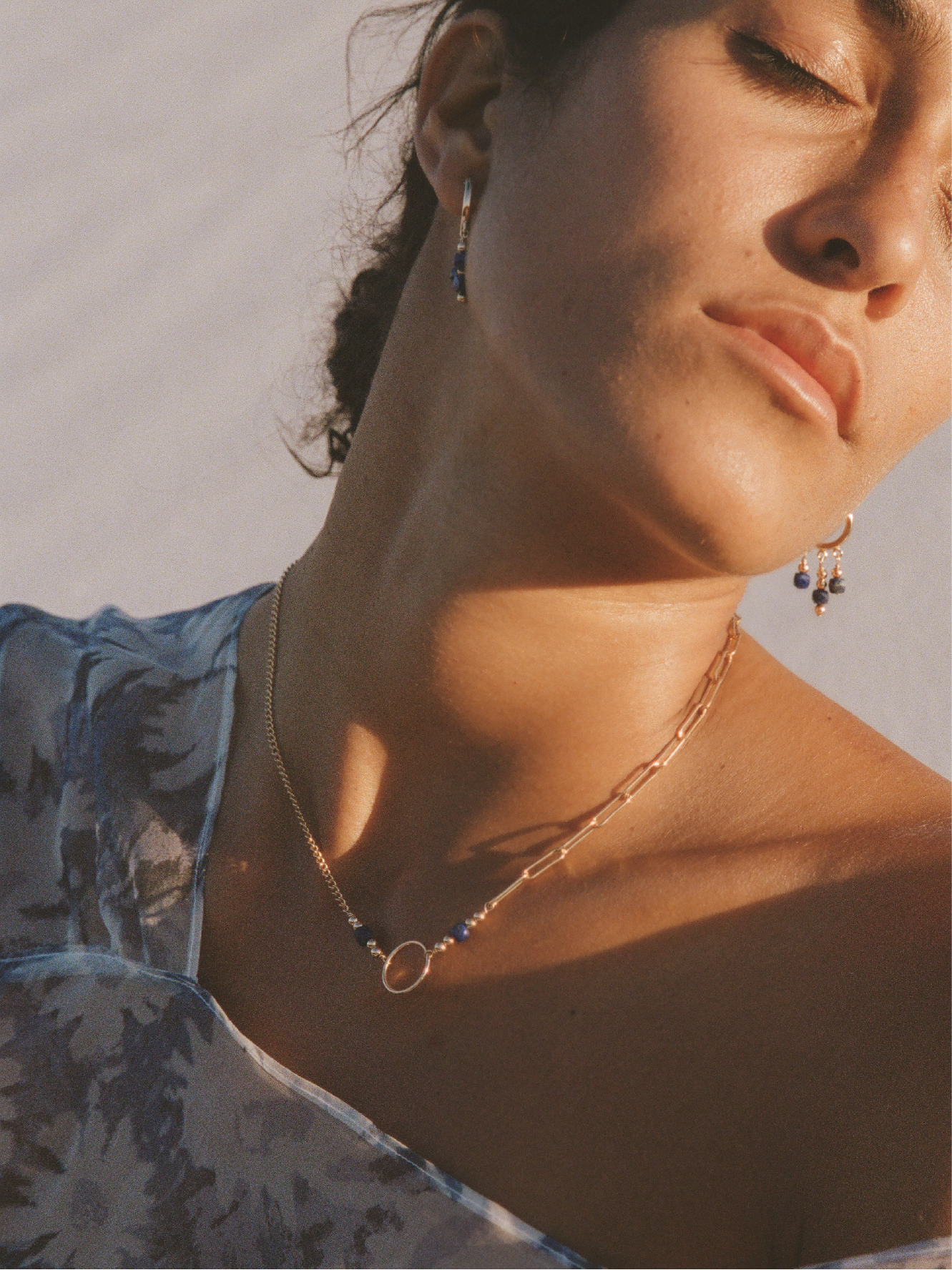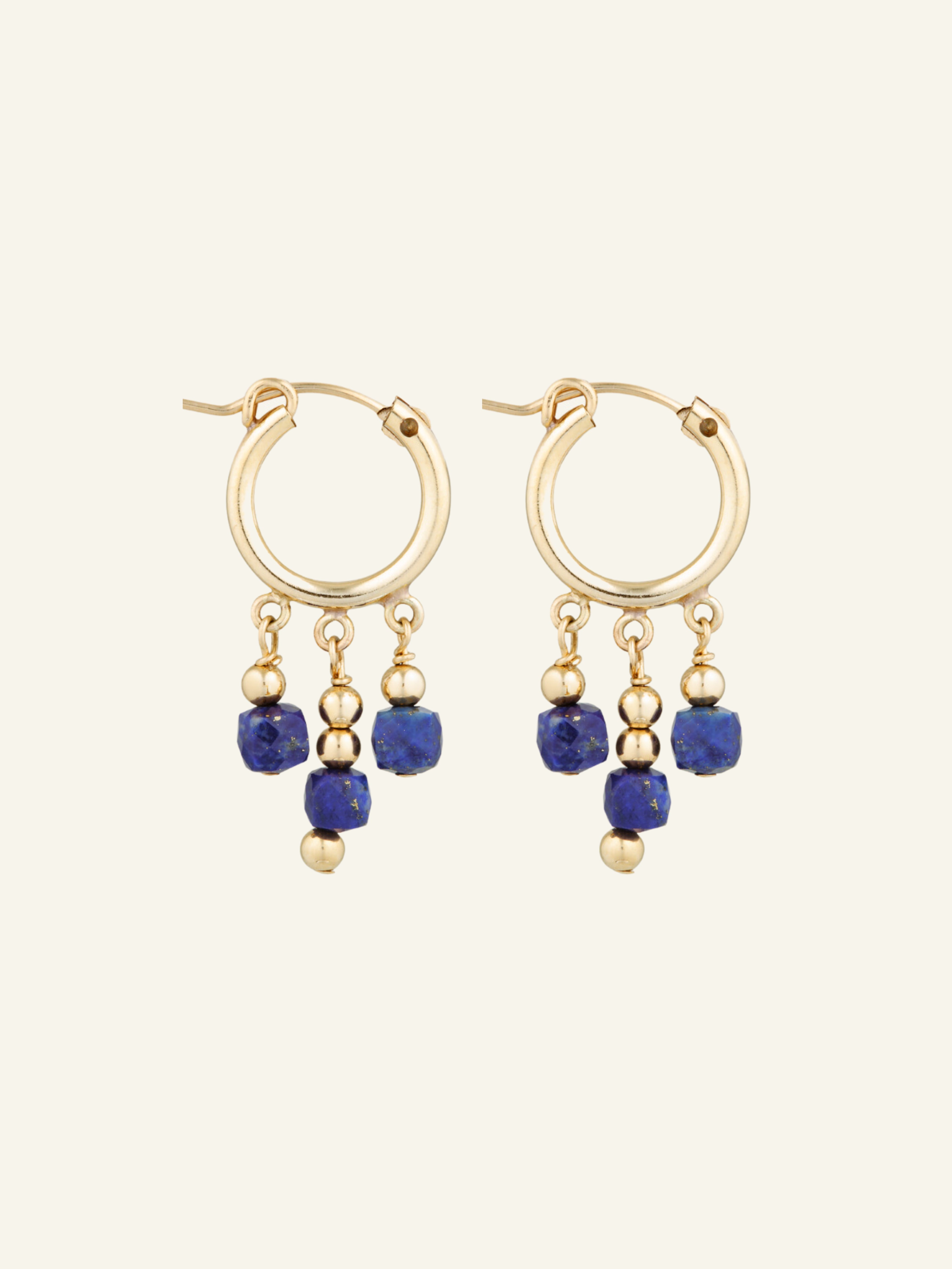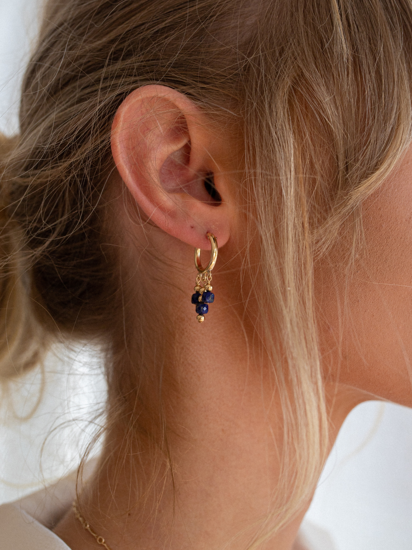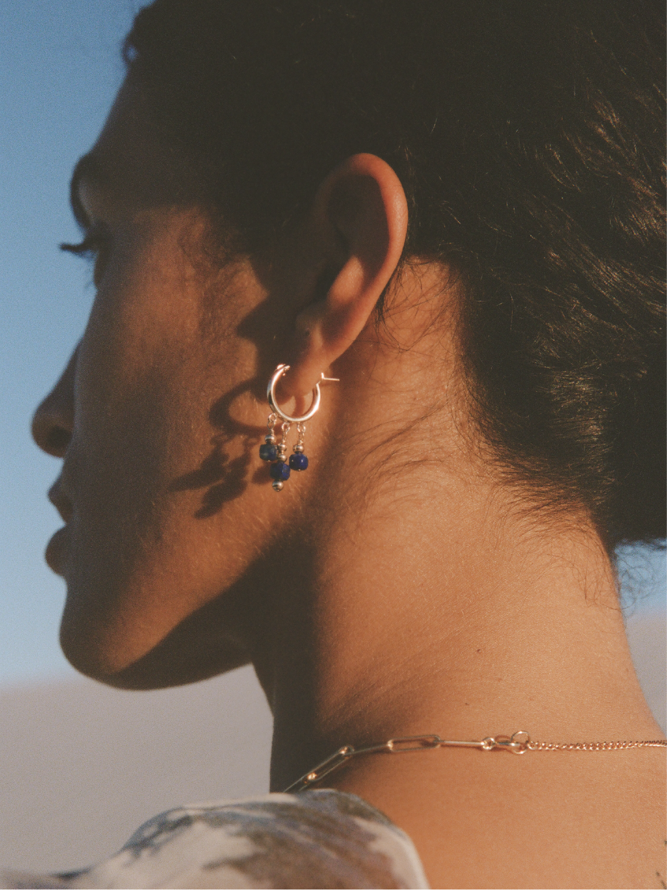 The Baina Hoops are our new lapis lazuli drop-down hoop that will be undeniably the new favourite hoops.