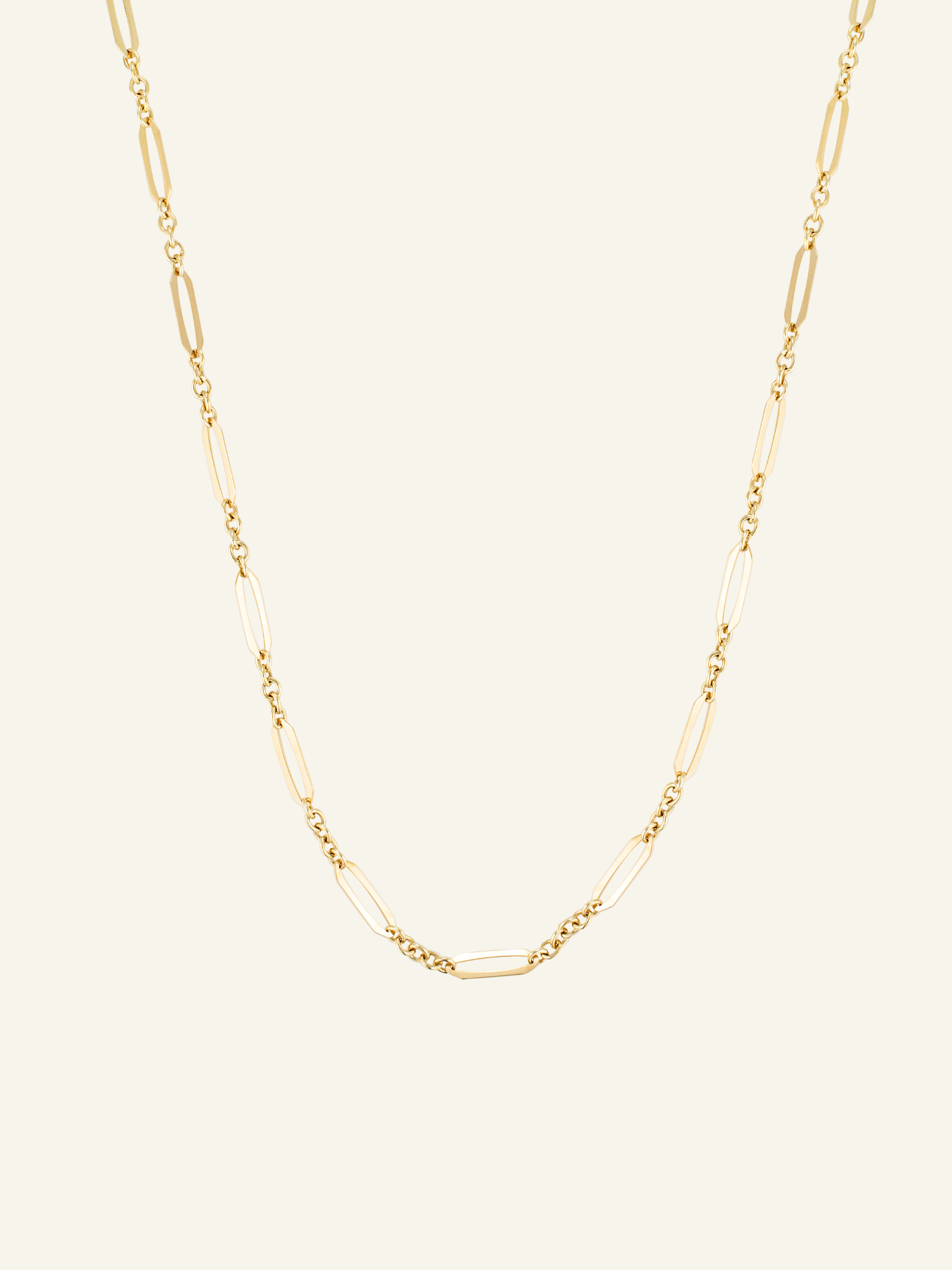 The 9k Solid Gold Cable Paperclip Necklace features an alternating cable link and paperclip chain design.