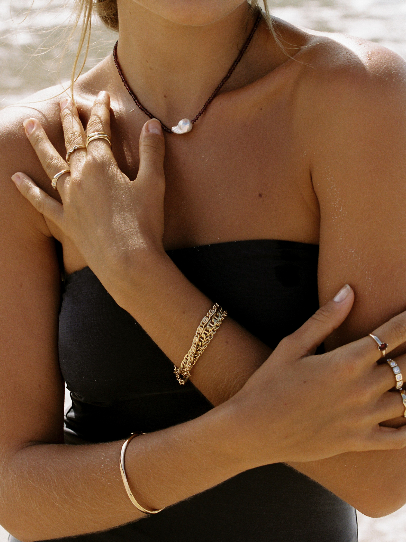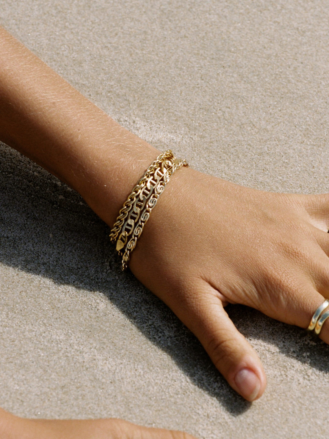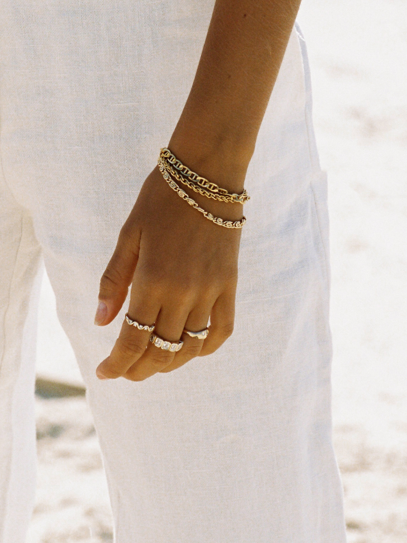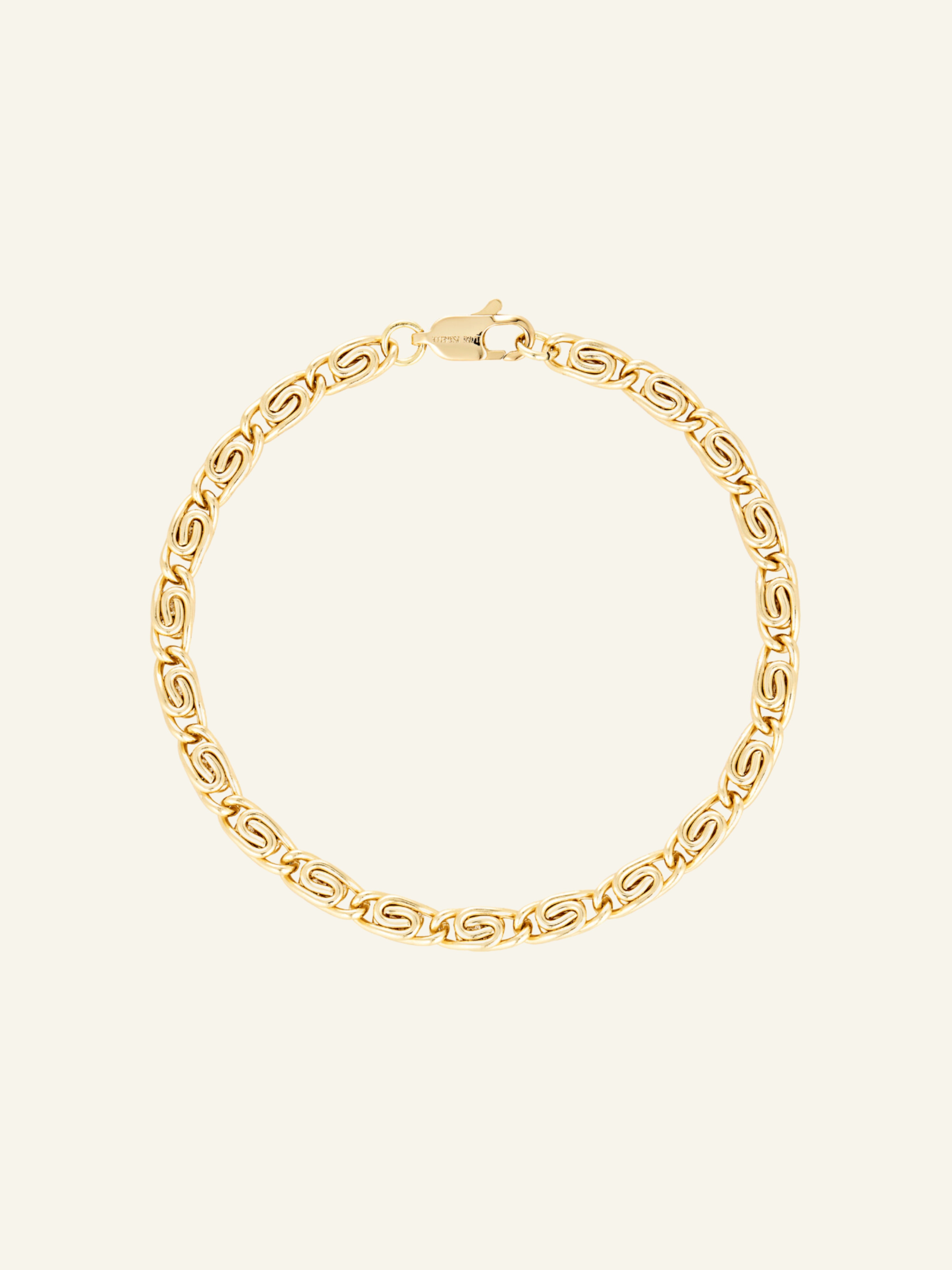 The Camilla Bracelet features a continuous scroll chain design, perfect for your everyday wardrobe.