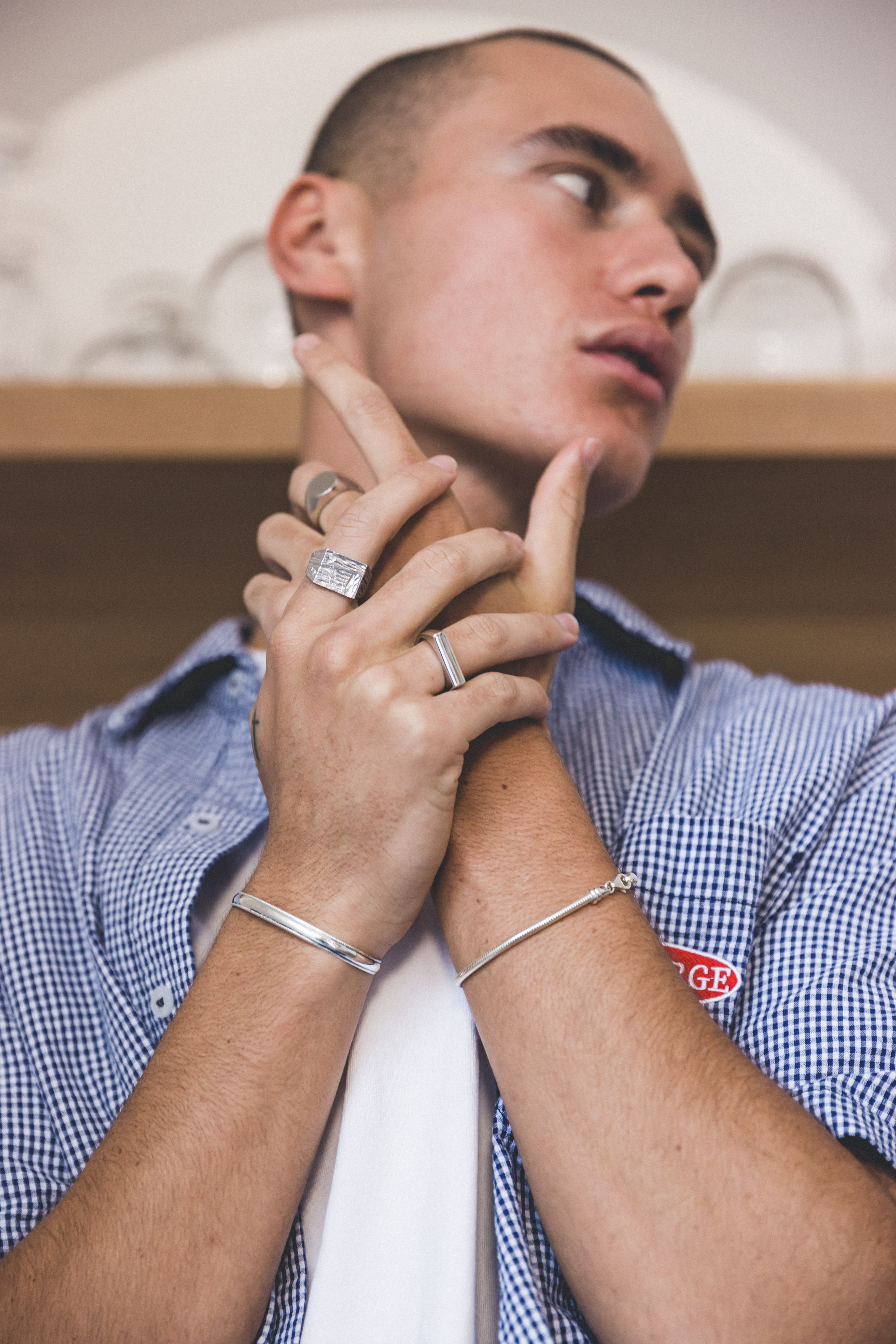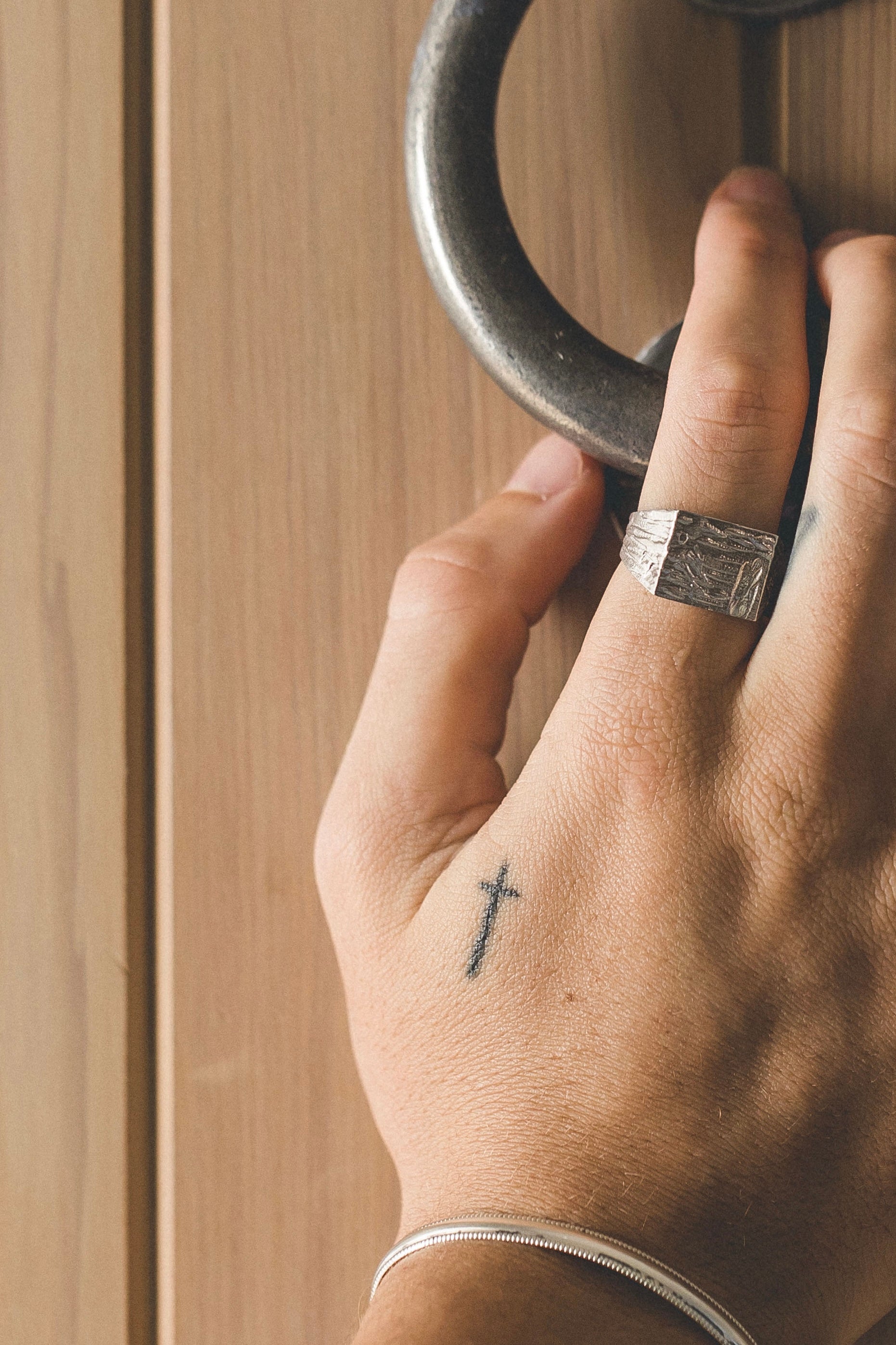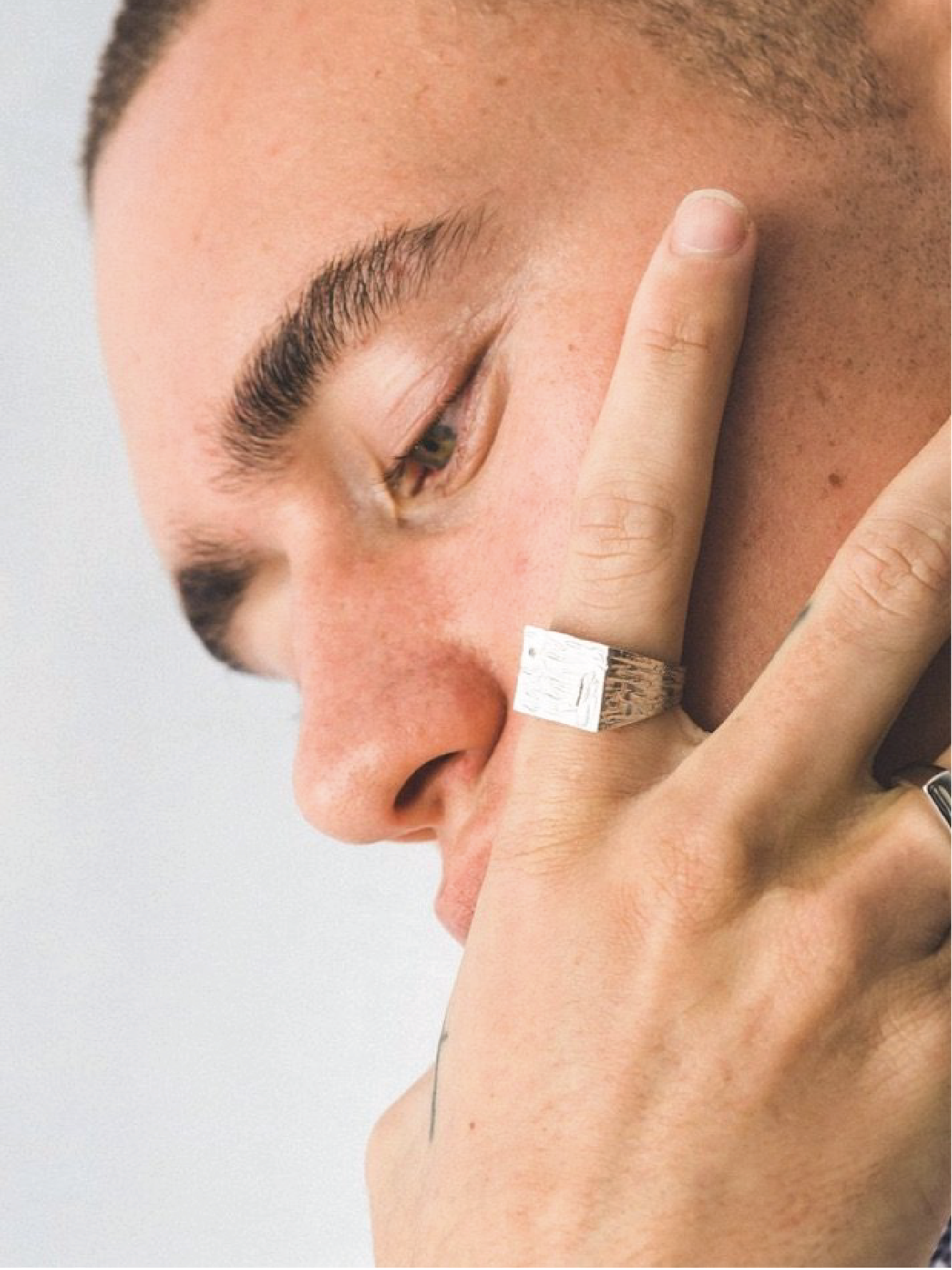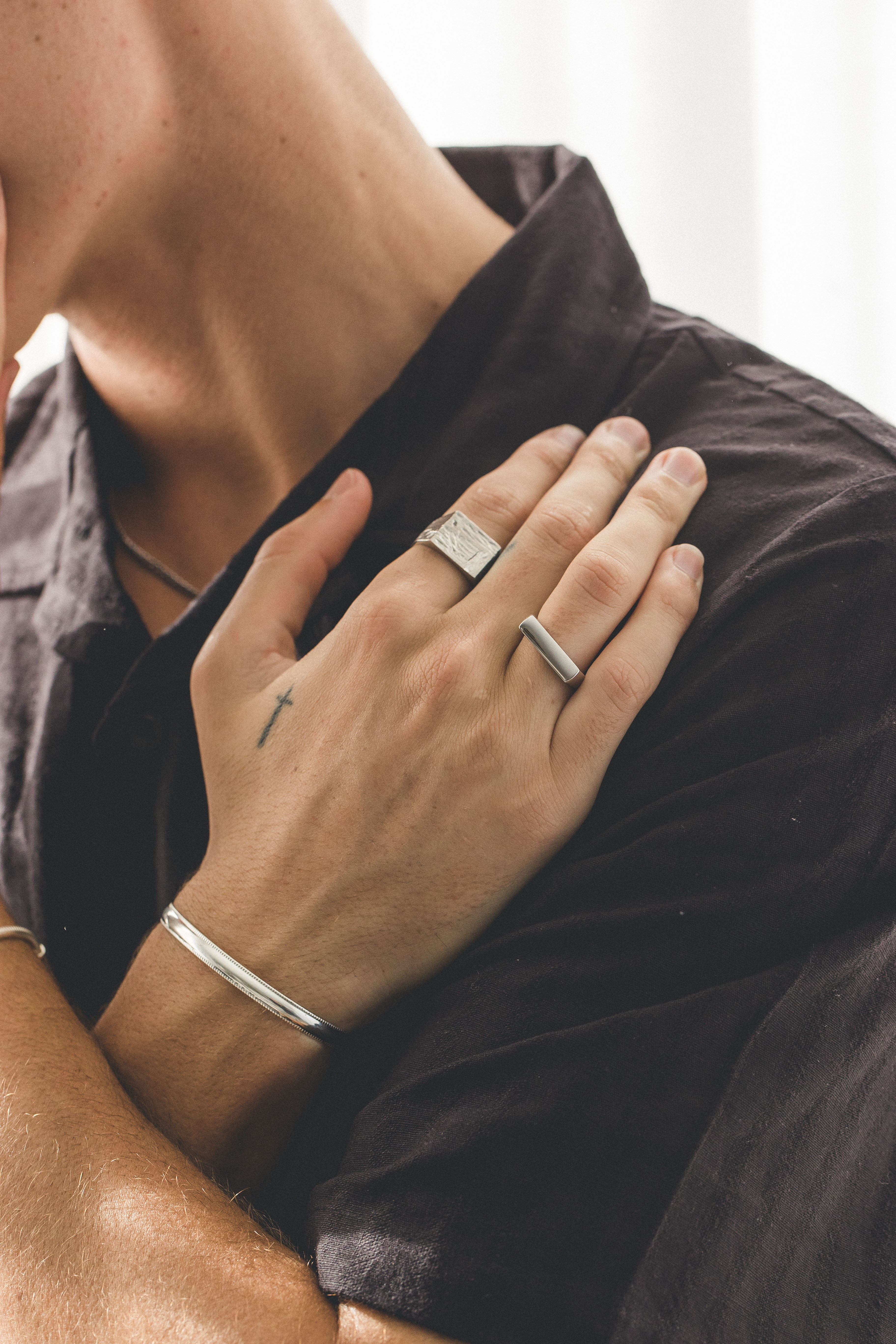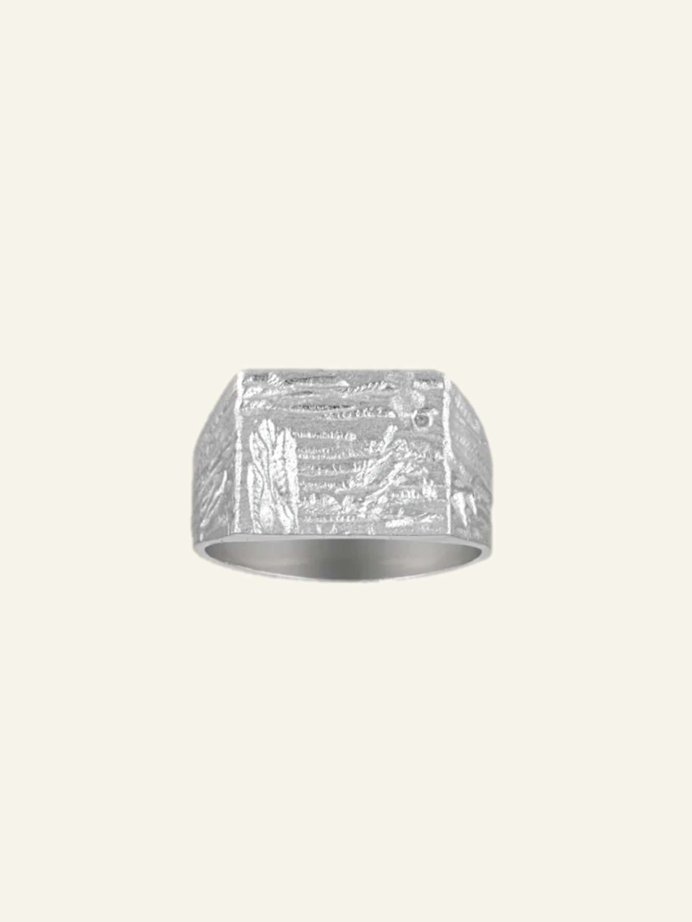 The Chester, a rectangle signet ring that presents a hammered and hand carved texture across the entire ring.