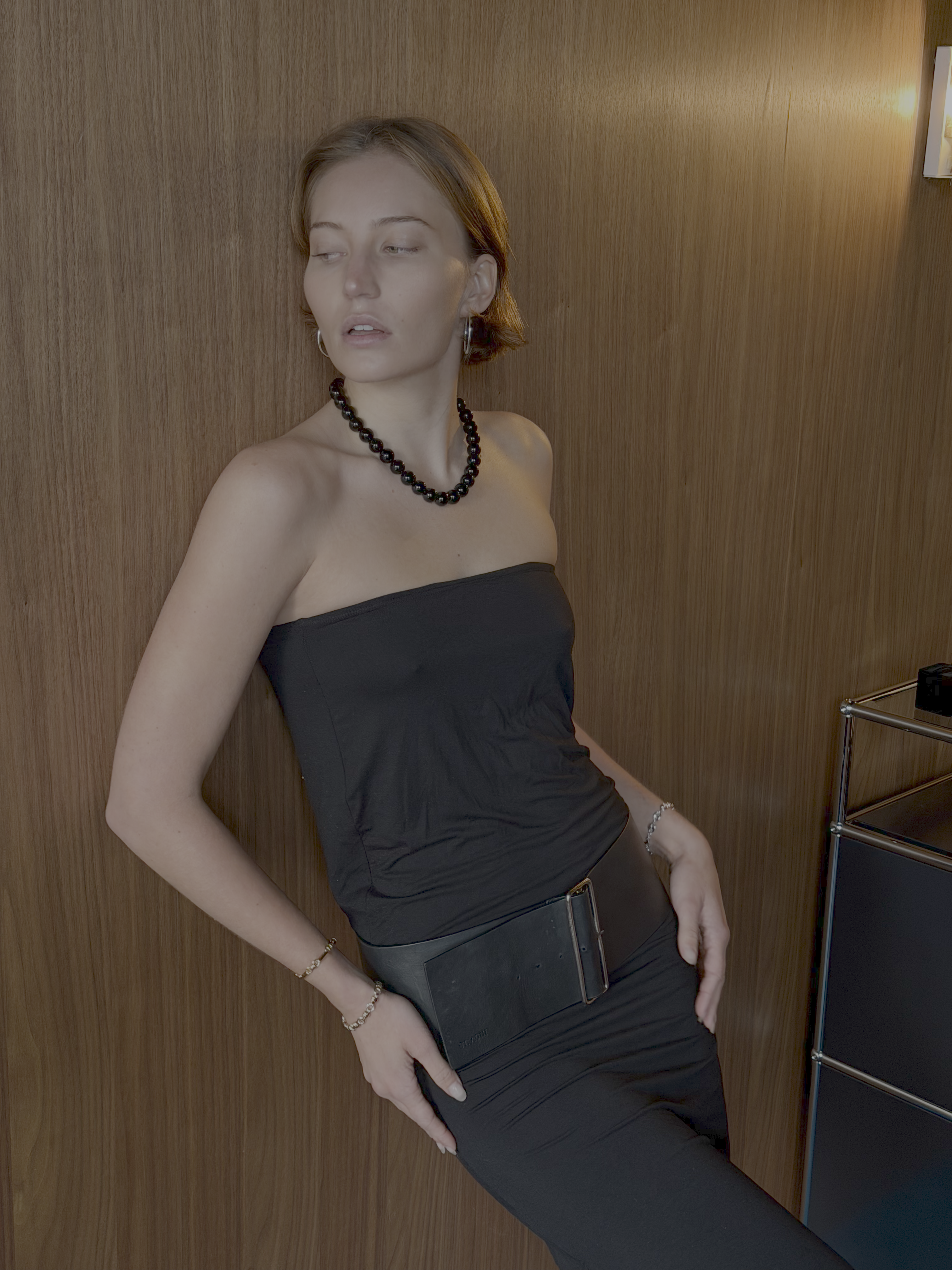 The Elu Onyx Necklace features 14mm black onyx beads and a bean clasp.