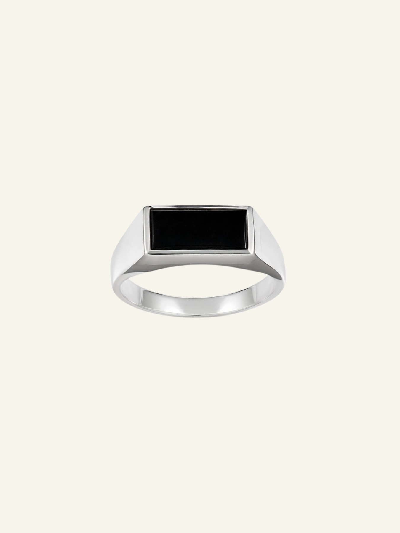 The Sterling Silver Rectangle Black Onyx Ring features a horizontal black onyx stone in a sterling silver signet ring.