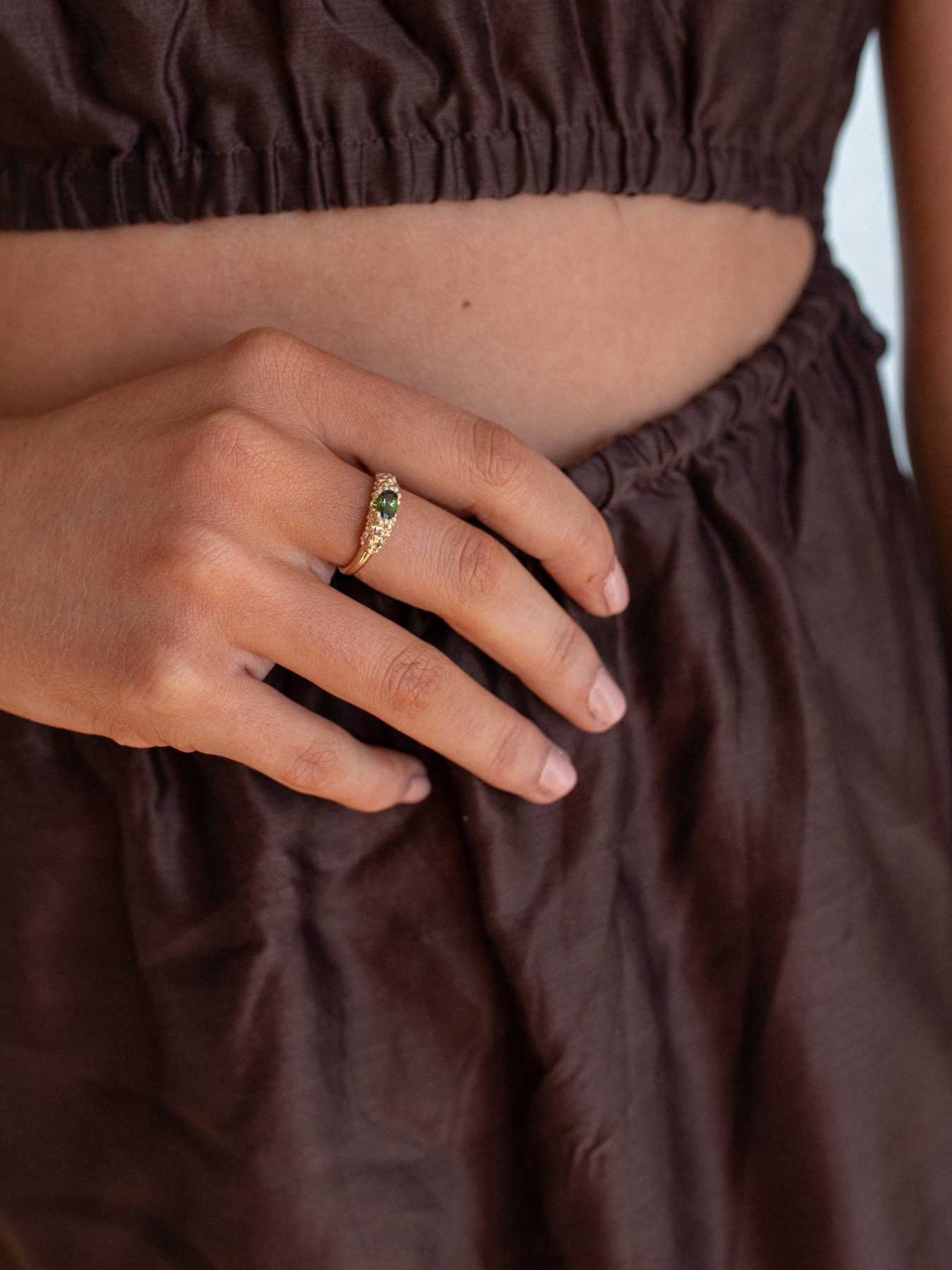 The Solid Gold Bubble Tourmaline Ring features a centre green tourmaline detailing bubbled texture surroundings.