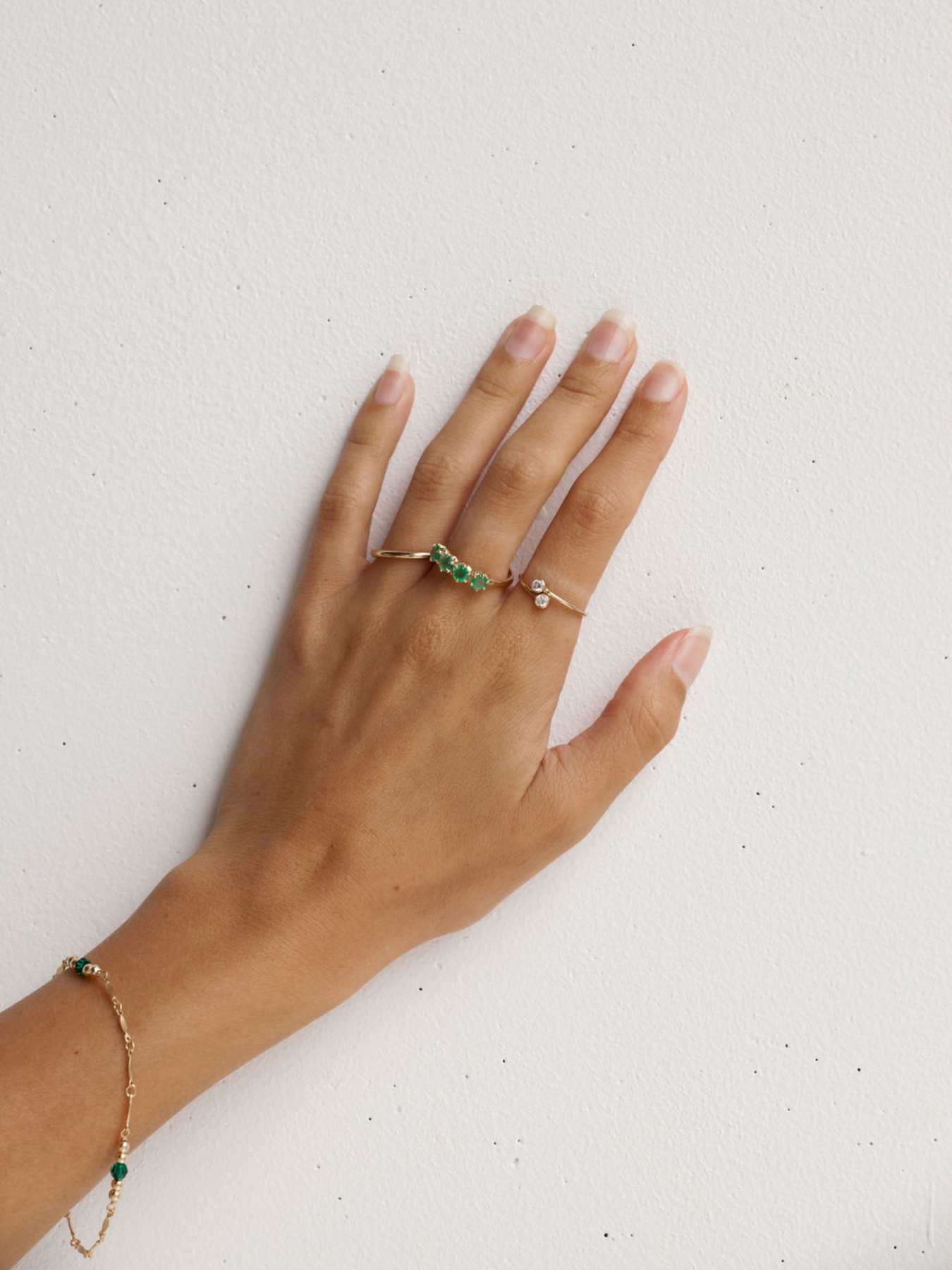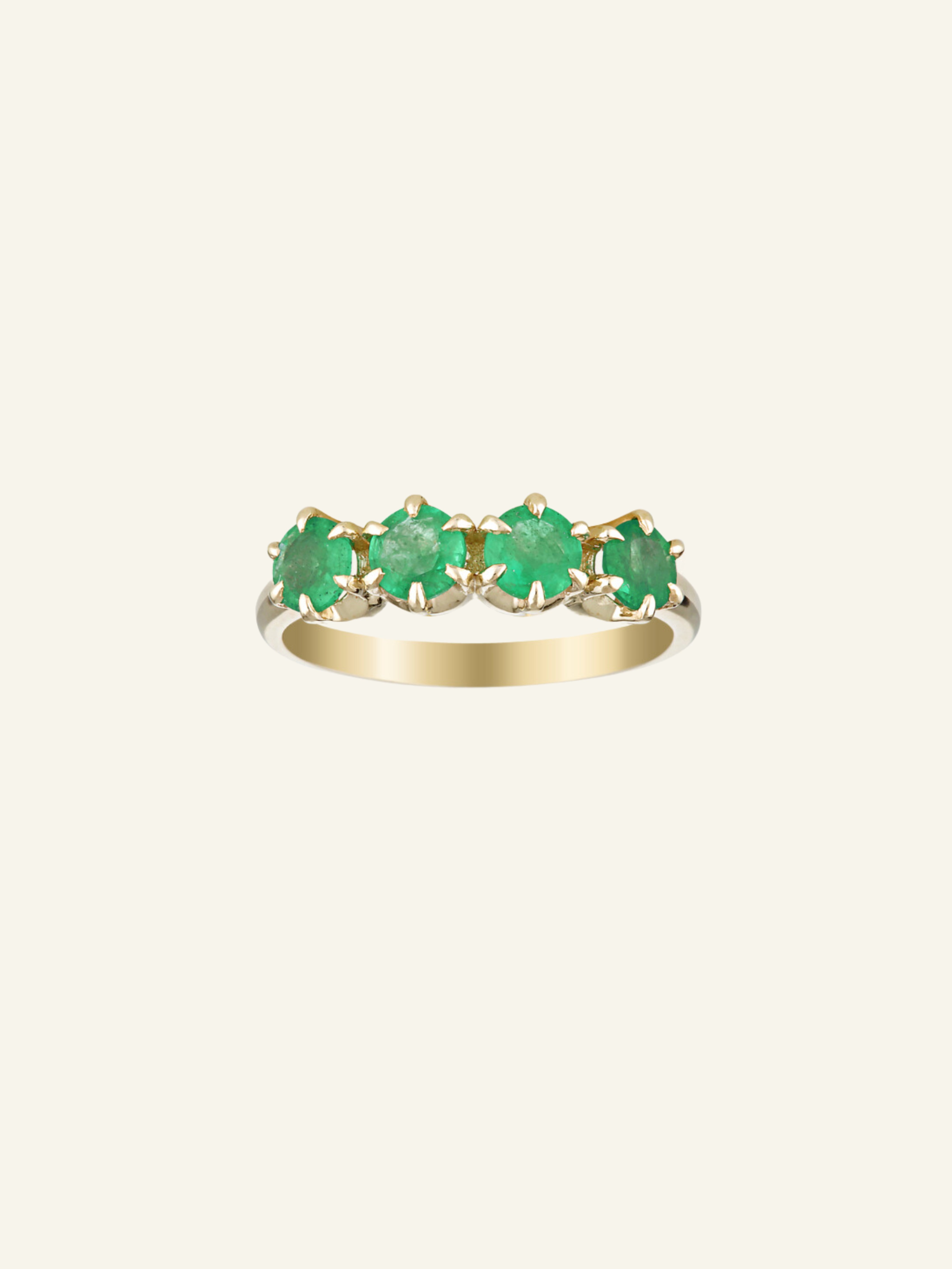 The Solid Gold Four Emerald Ring features four round emerald stones set in prongs with a 9k or 14k solid shank. A reconstructed design of the classic ring, this is the perfect gift for your loved one.
