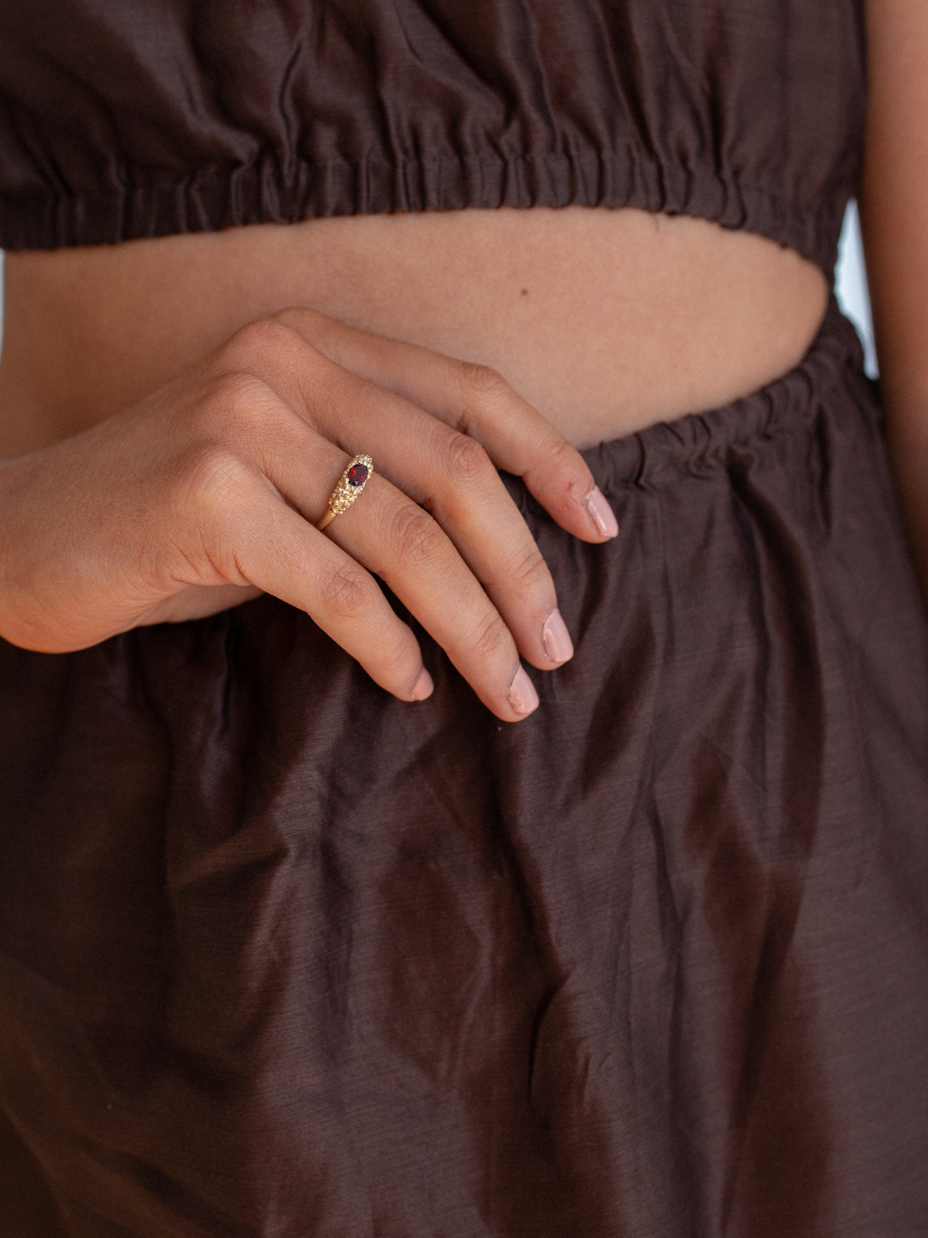 The Solid Gold Bubble Garnet Ring features a centre garnet detailing bubbled texture surroundings.