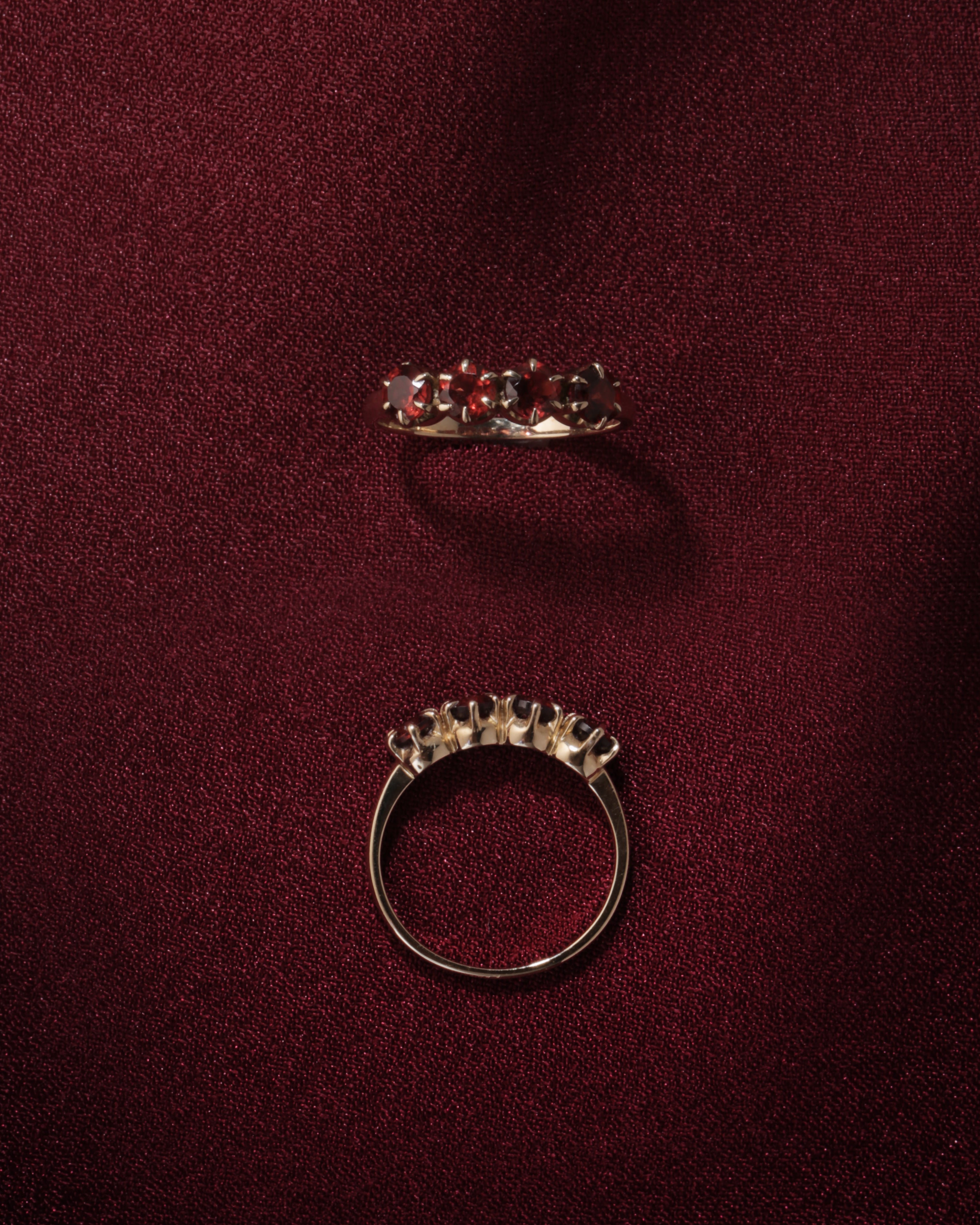 The Solid Gold Four Garnet Ring features four round garnet stones set in prongs with a 9k or 14k solid shank. A reconstructed design of the classic ring, this is the perfect gift for your loved one.