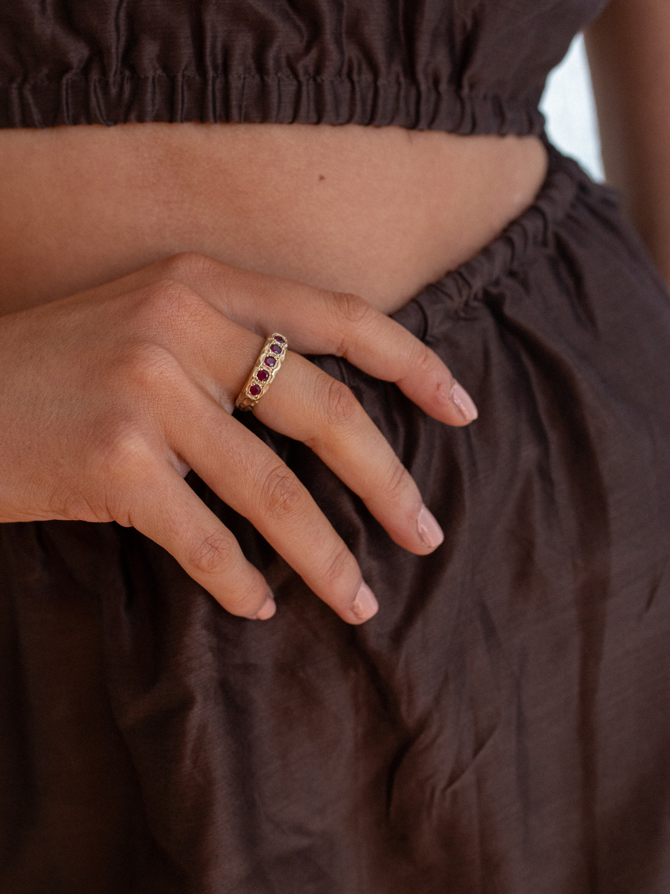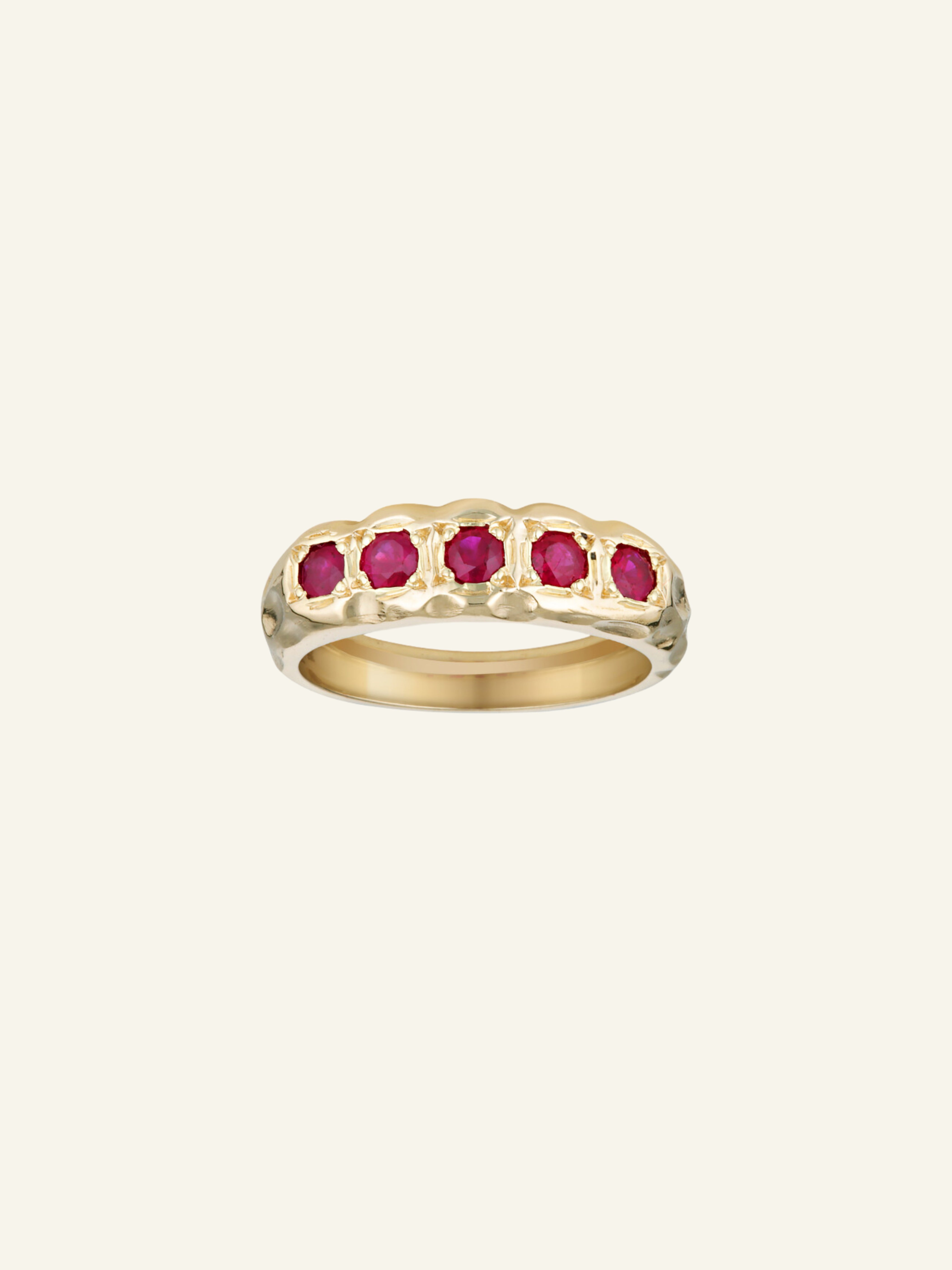 The Solid Gold Five Ruby Textured Ring features five ruby stones in a hammered detail band.