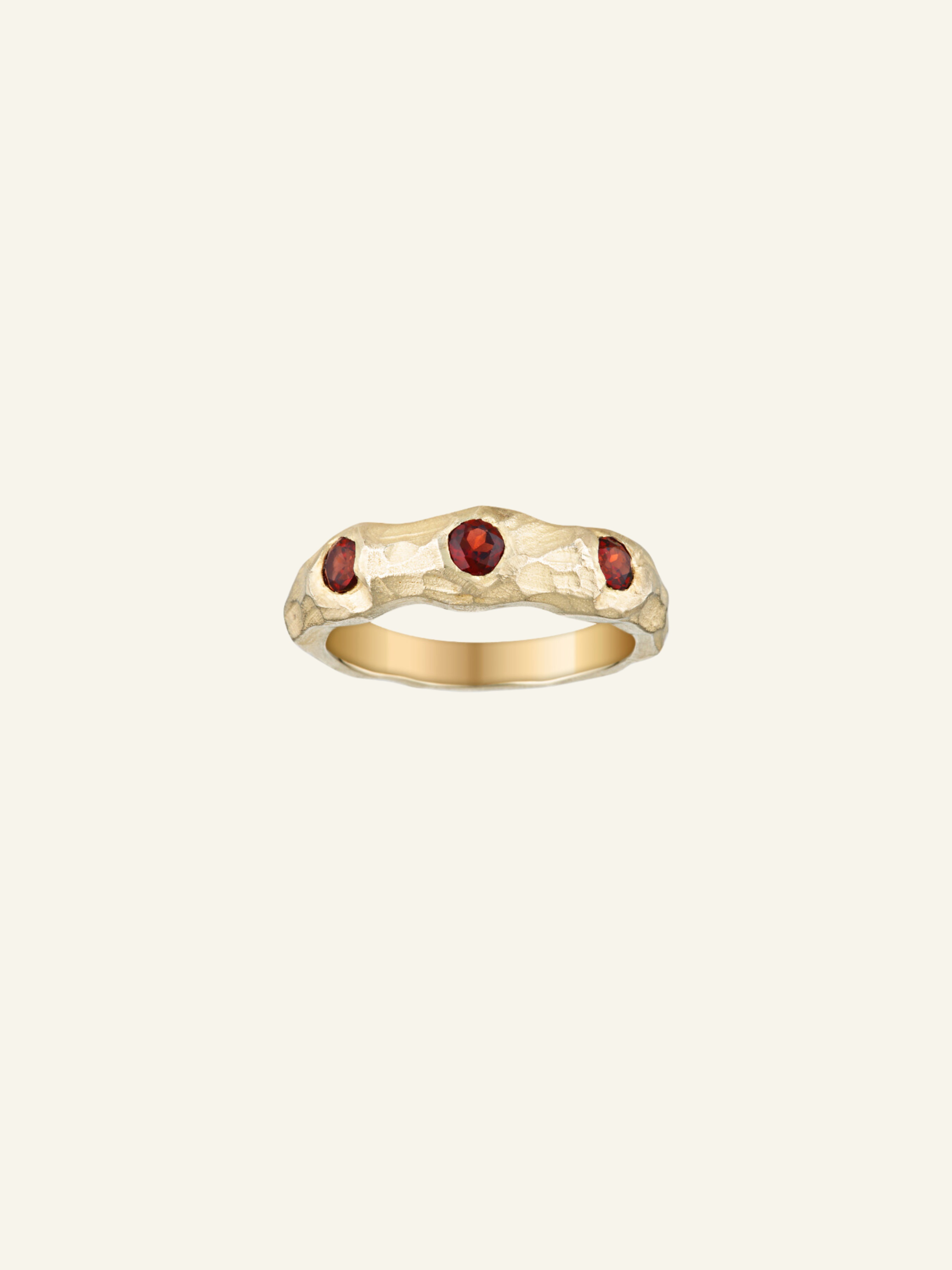 The Solid Gold Textured Garnet Ring features three round garnet stones set in a textured band. A reconstructed design of our Four Garnet Ring, this is the perfect gift for your loved one.