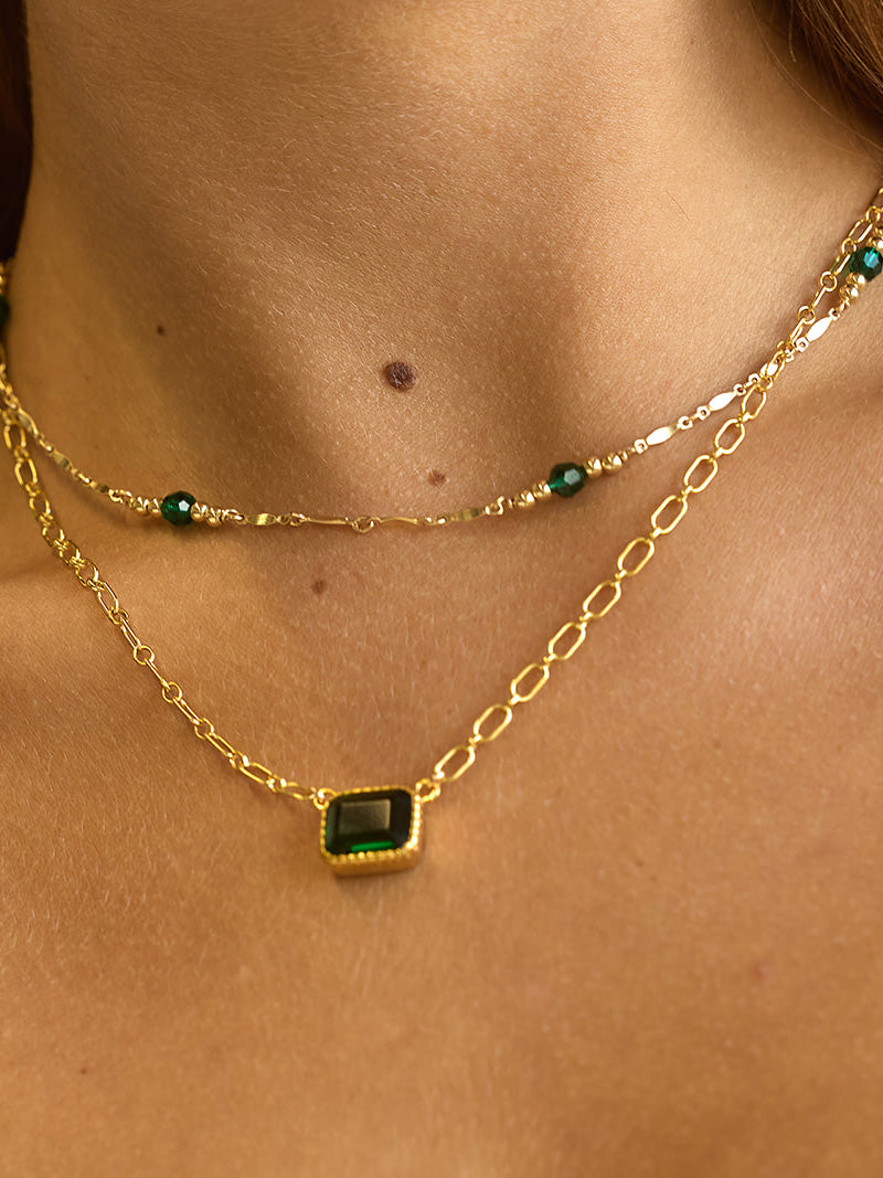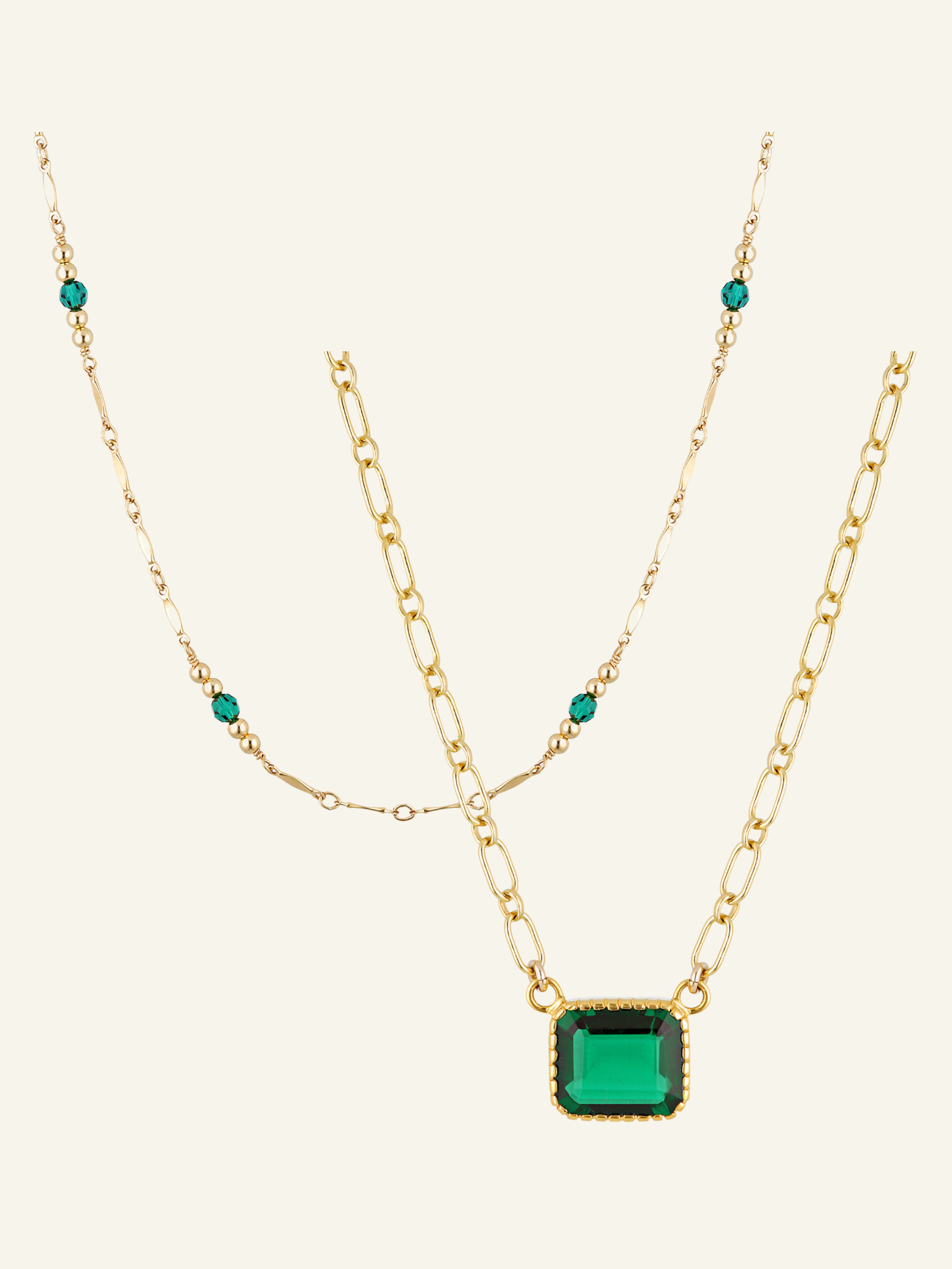 The Emerald Necklace Bundle layers the Zoey Necklace and the Hollie Necklace, to create the perfect emerald necklace combo.