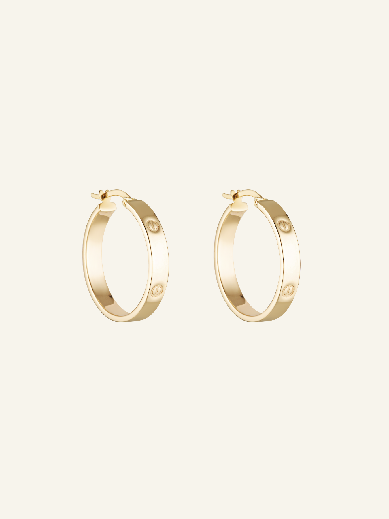 The 9k Solid Gold Square Tube Hoops feature a round hoop with 5 screw details engraved.