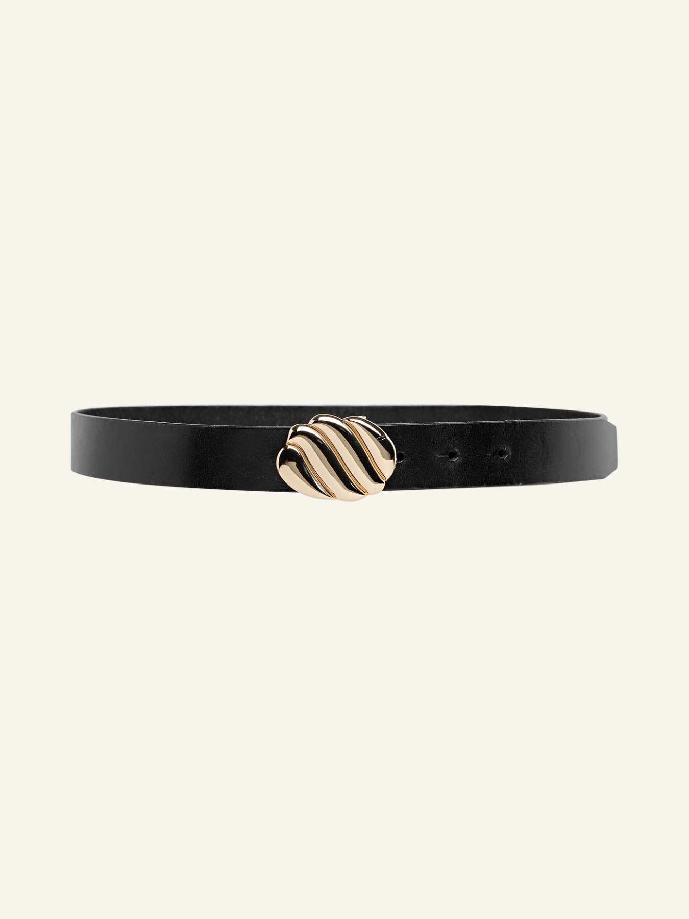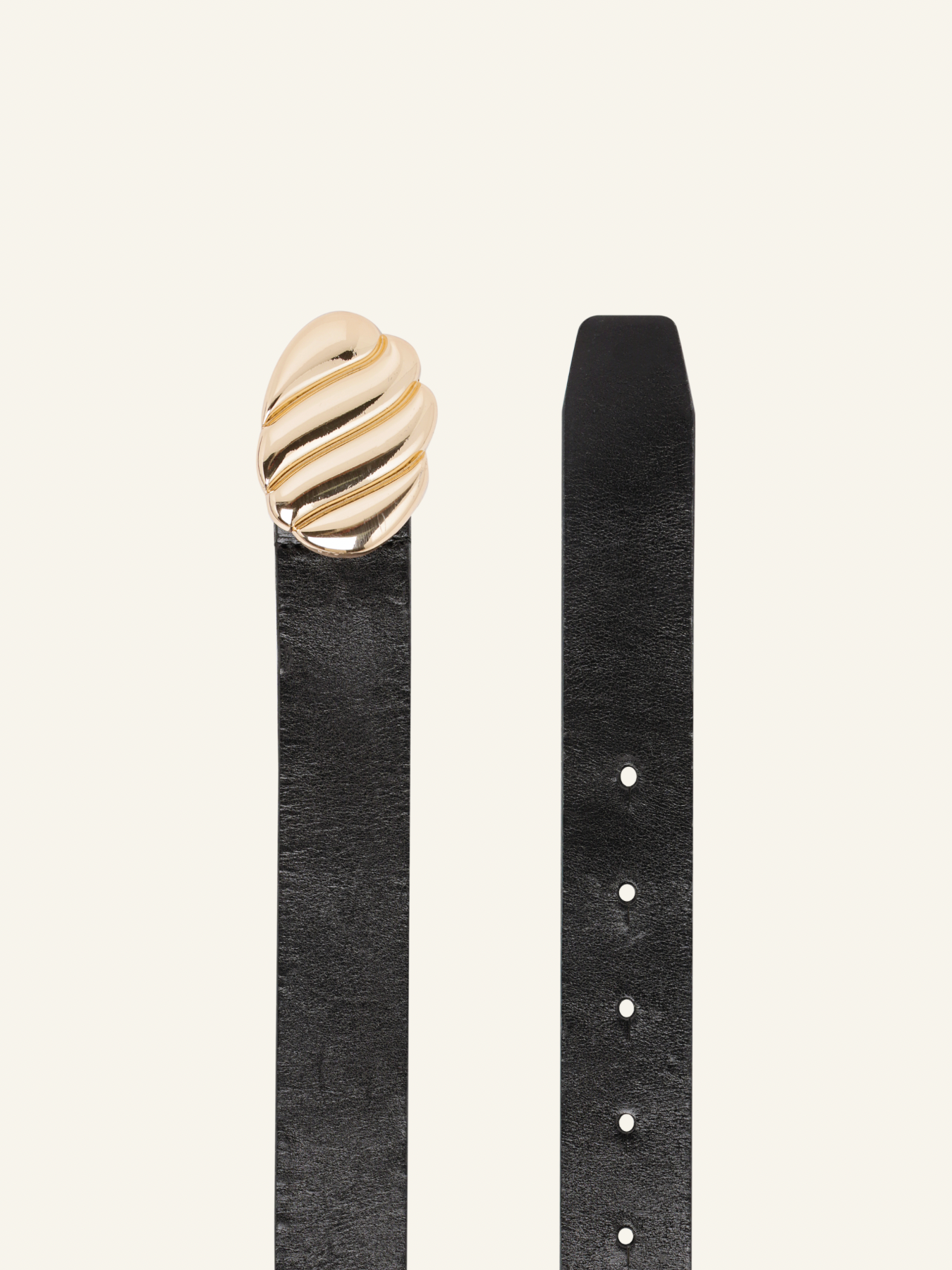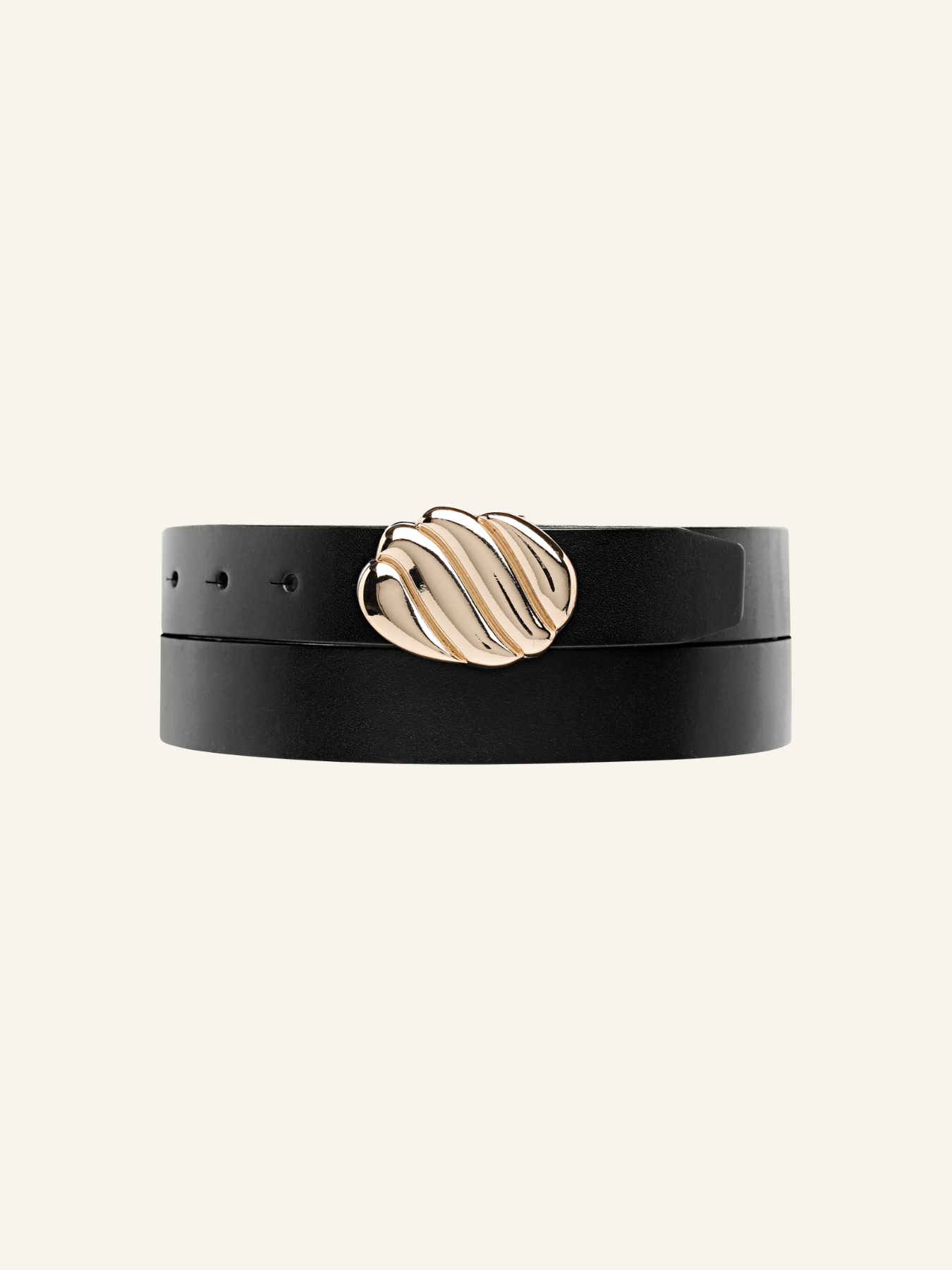 Add a luxurious statement to your everyday look with the Iris Belt. Made with 100% leather with a beautiful custom gold croissant statement buckle.