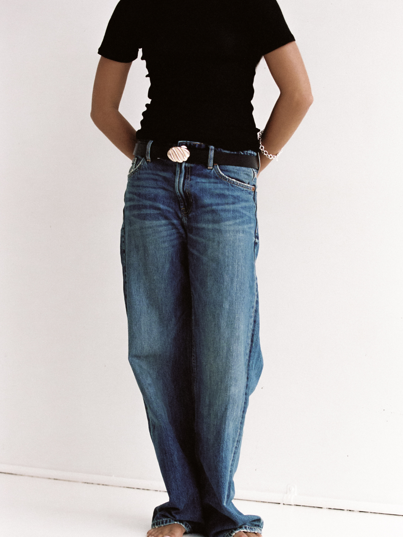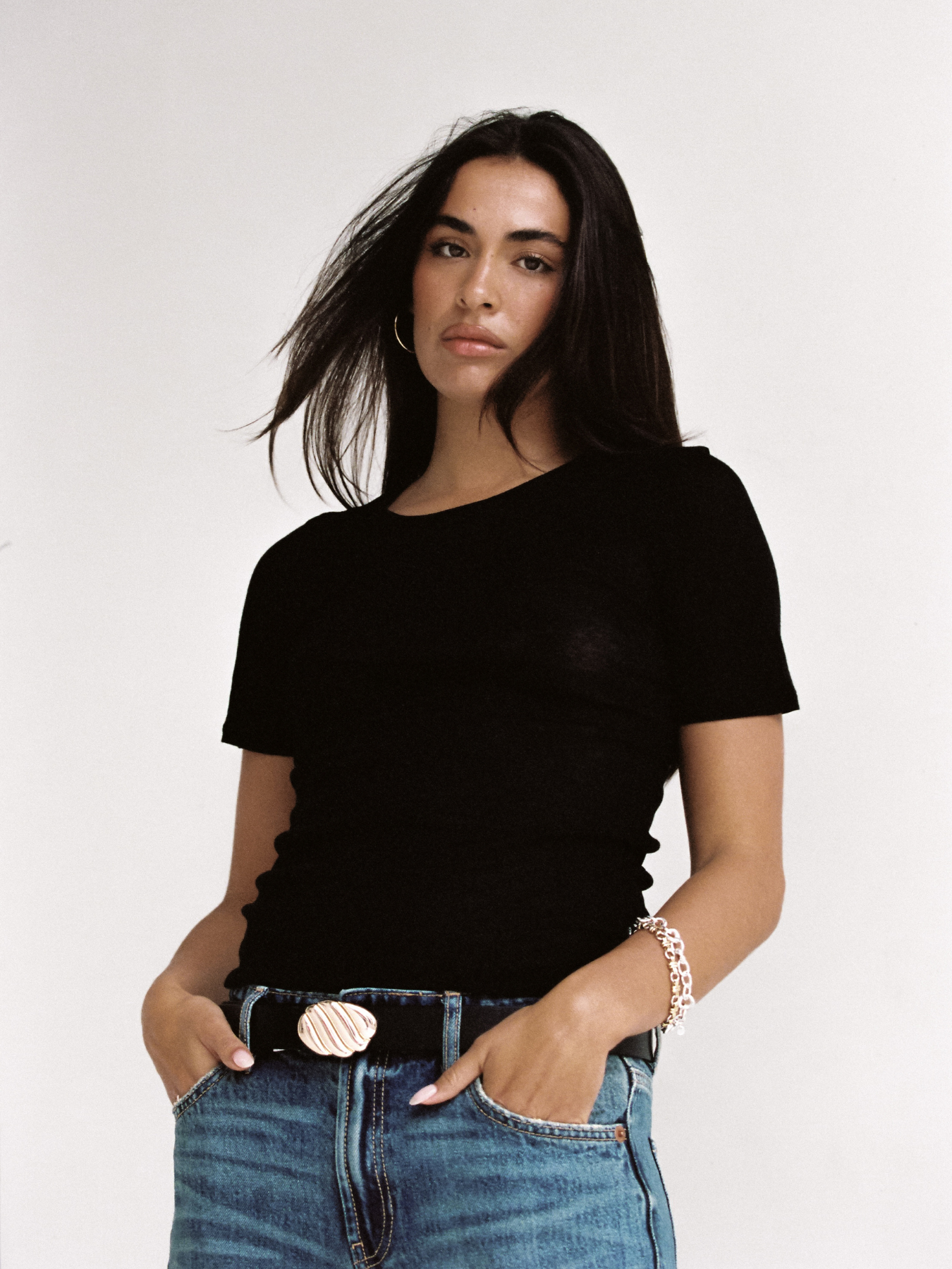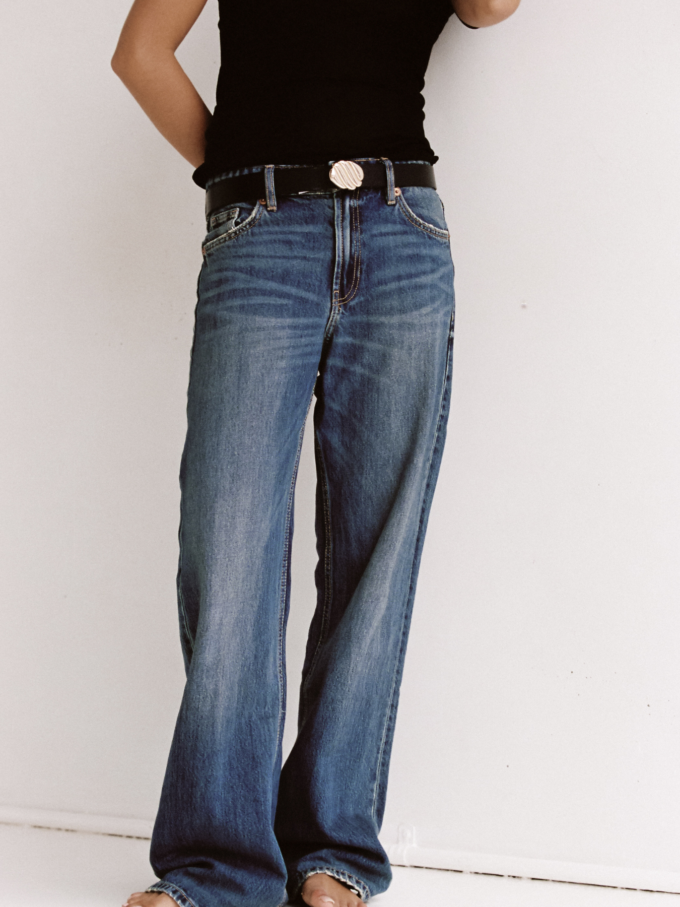 Add a luxurious statement to your everyday look with the Iris Belt. Made with 100% leather with a beautiful custom gold croissant statement buckle.