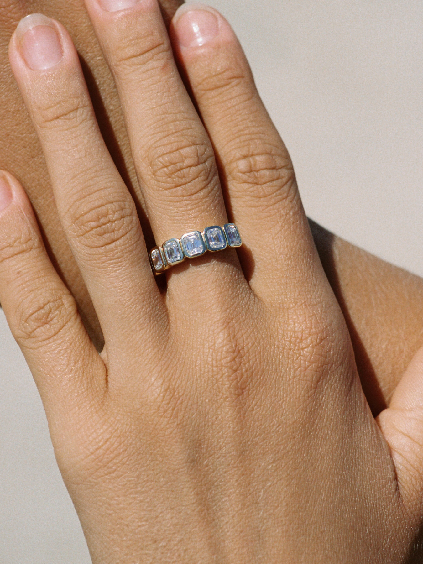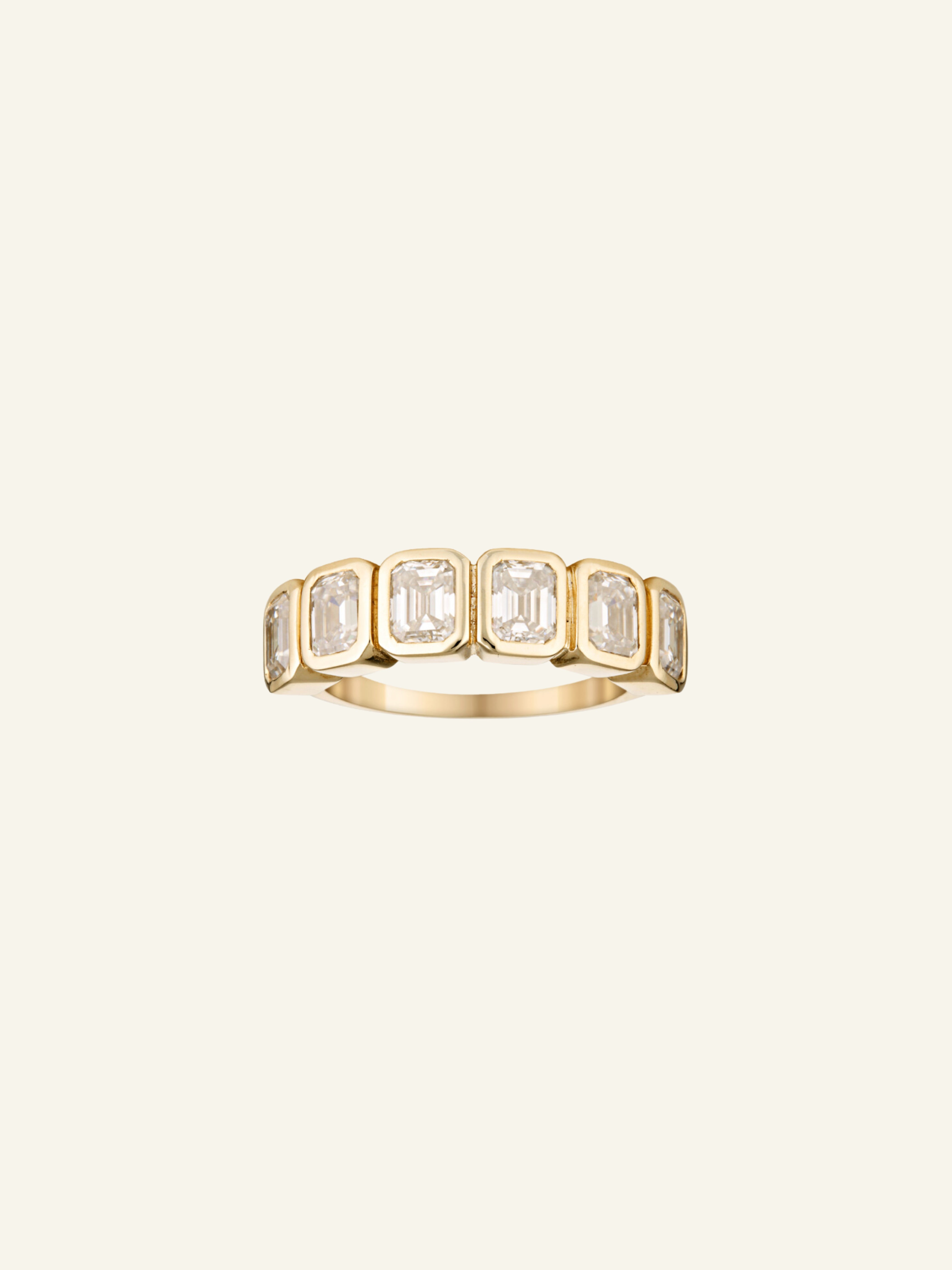 The Solid Gold Emerald Cut Half Eternity Band features six emerald cut moissanite stones, lined in a row of brilliance.