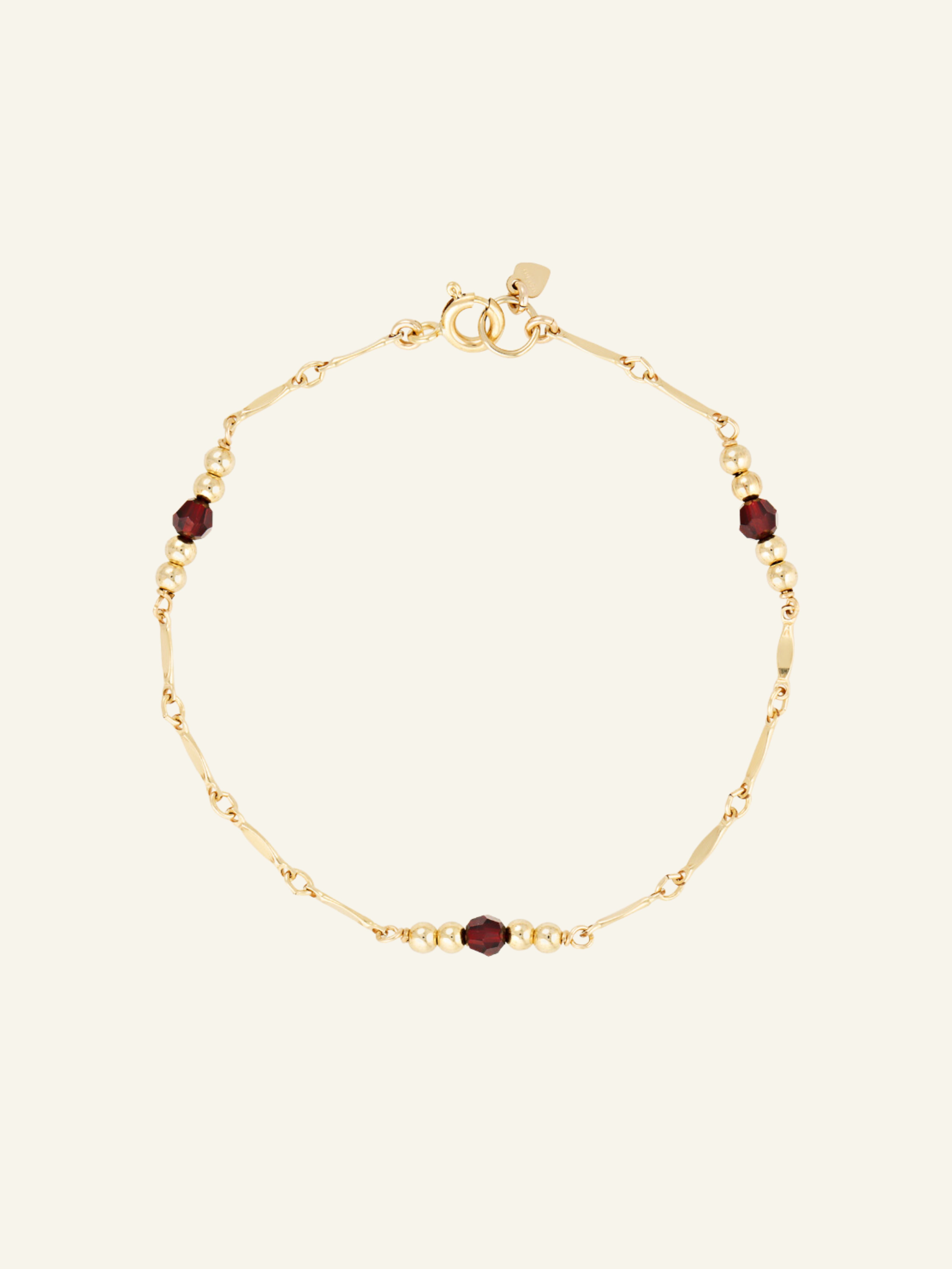 The Carmine Bracelet features a bar chain with a repeated garnet and gold bead combination for a beautiful bracelet or anklet.