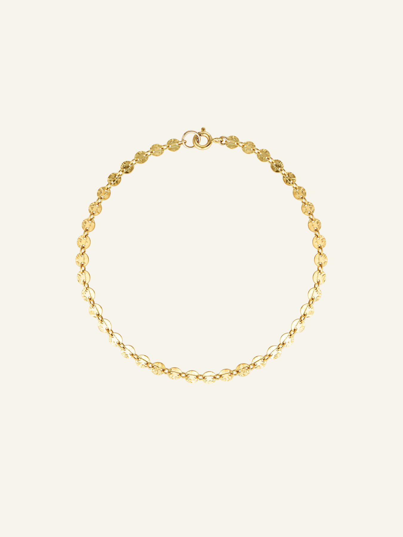 The Diana Bracelet features a textured disc chain, designed to be layered with your other favourite gold bracelets.