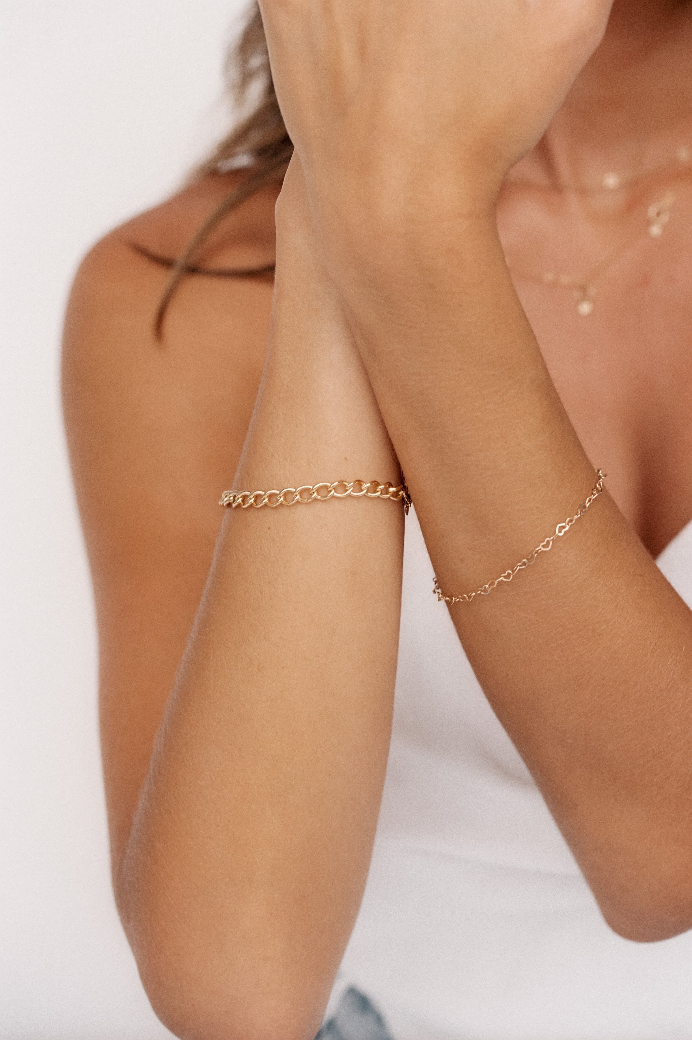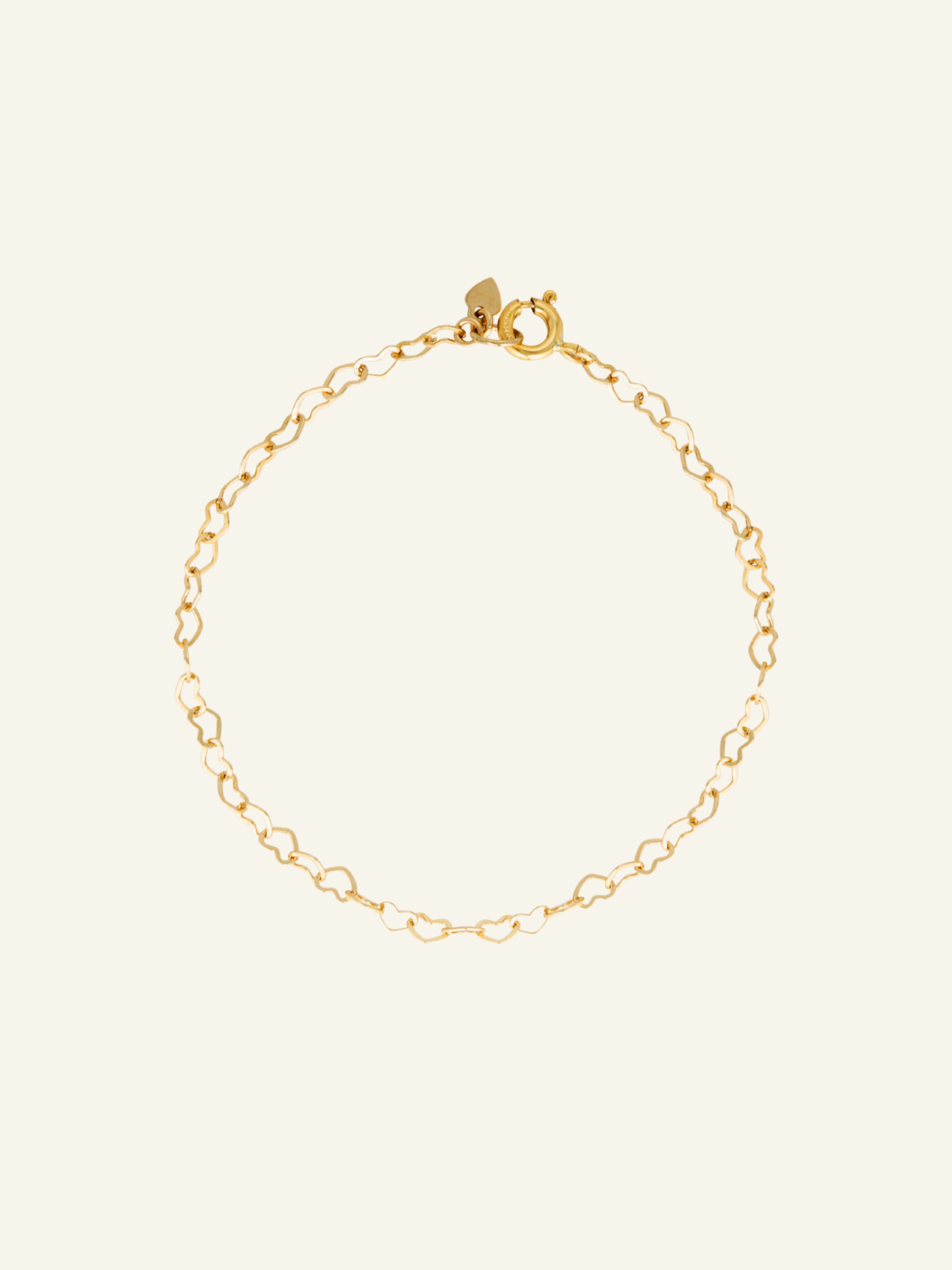 The Estelle Bracelet features a dainty, continuous hear chain design.