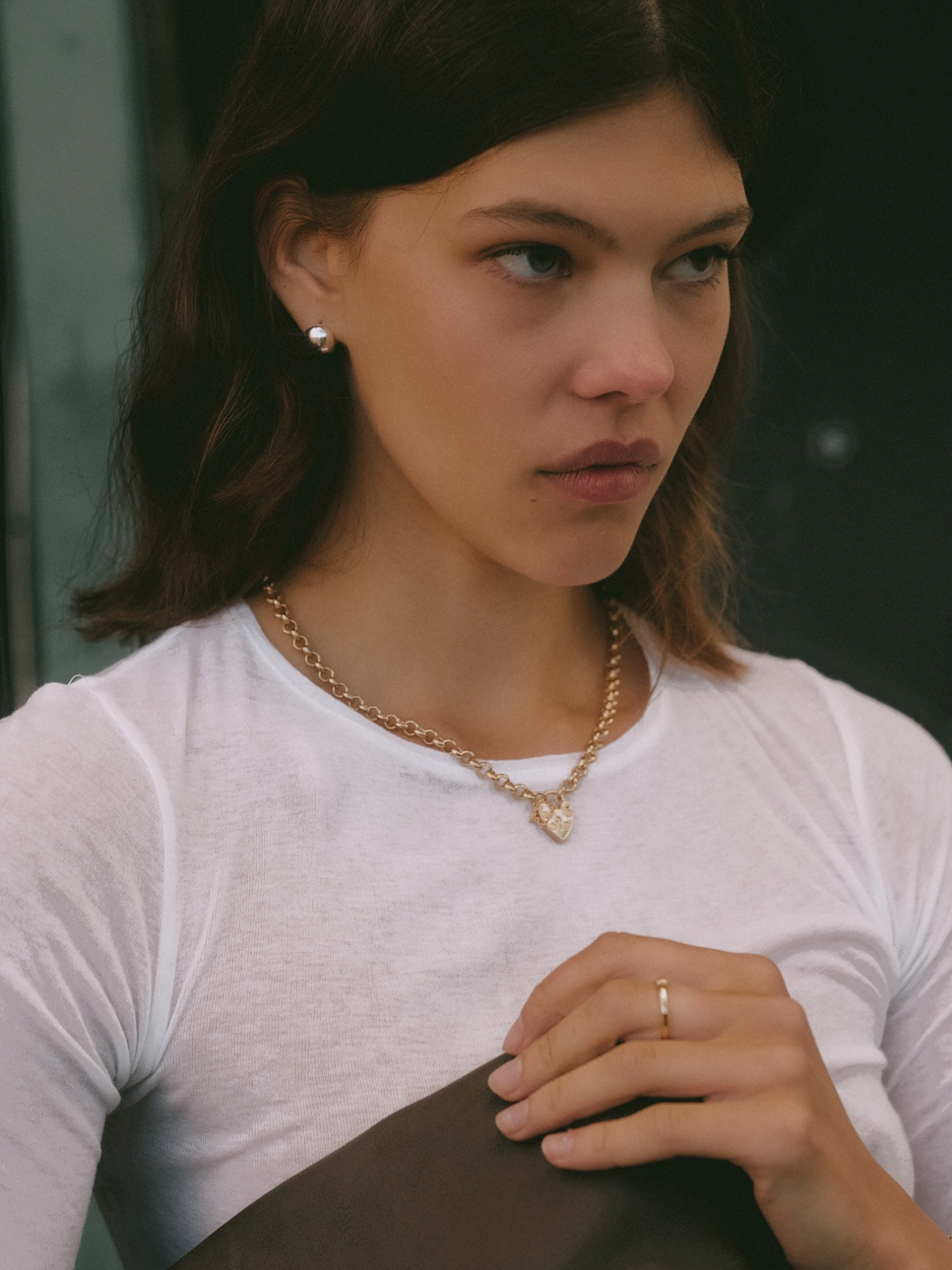 The Fleur Necklace features a vintage rolo chain with a heart locket and chain, a true heirloom piece.