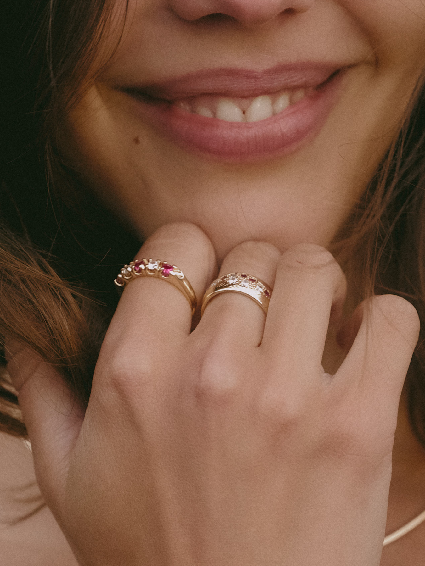 The Leya Ring features a classic five prong band beautiful ruby and diamond stone detailing.