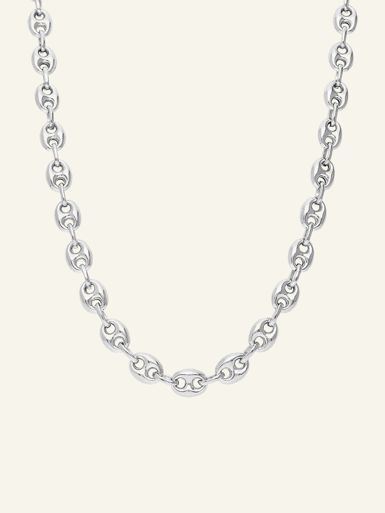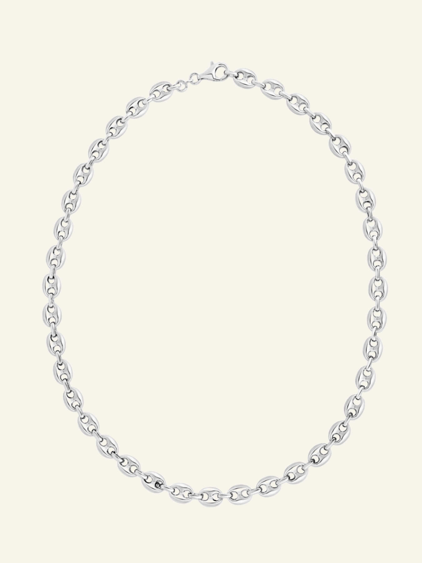 The Ploy Necklace features a sterling silver anchor chain with puffed round mariner links.