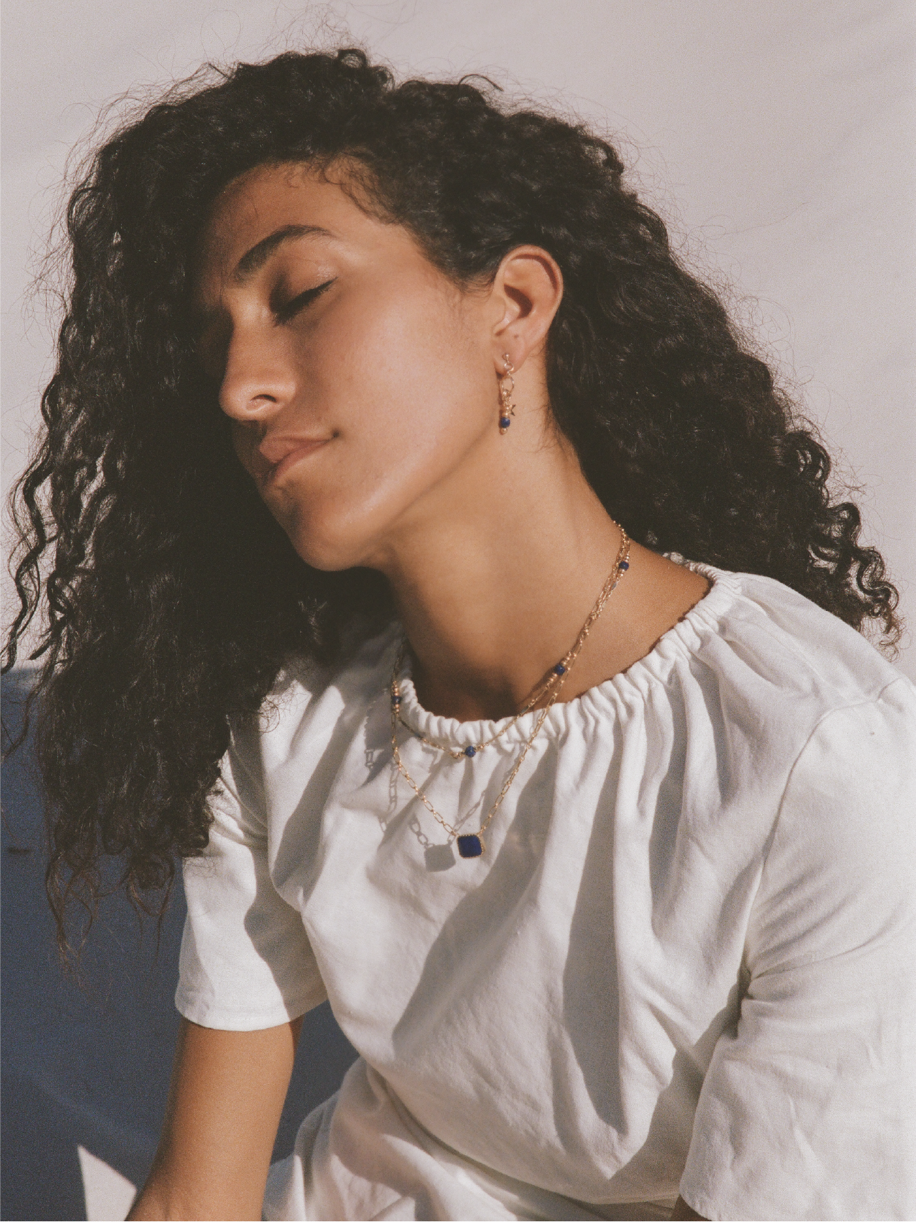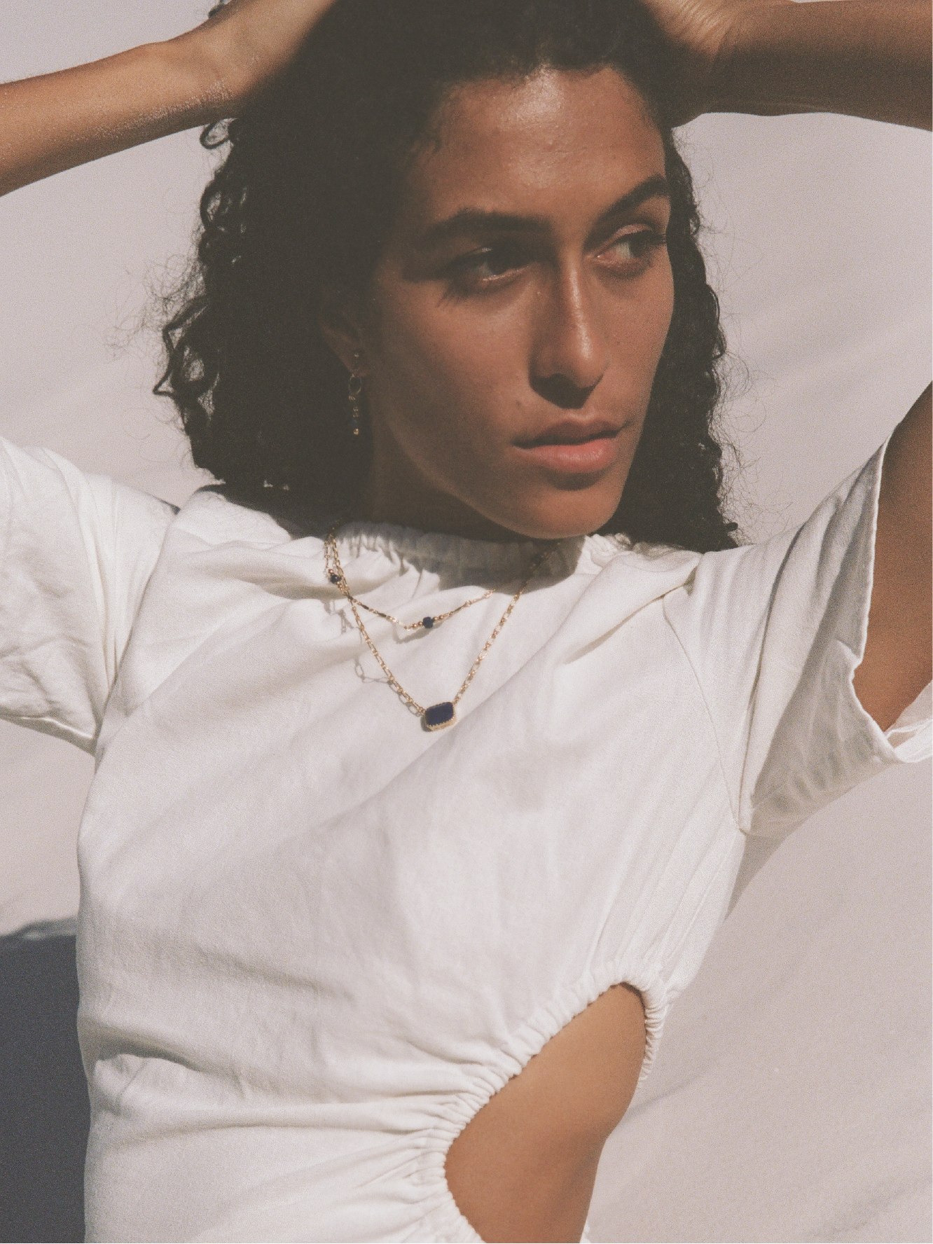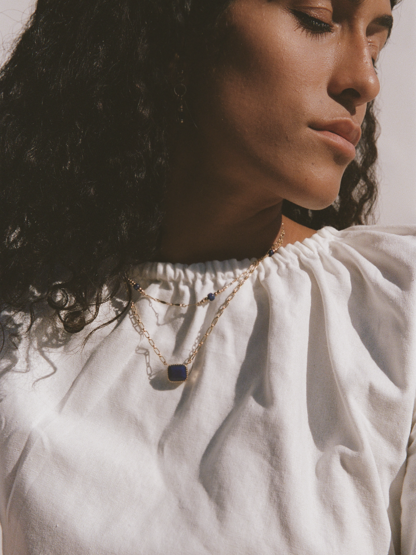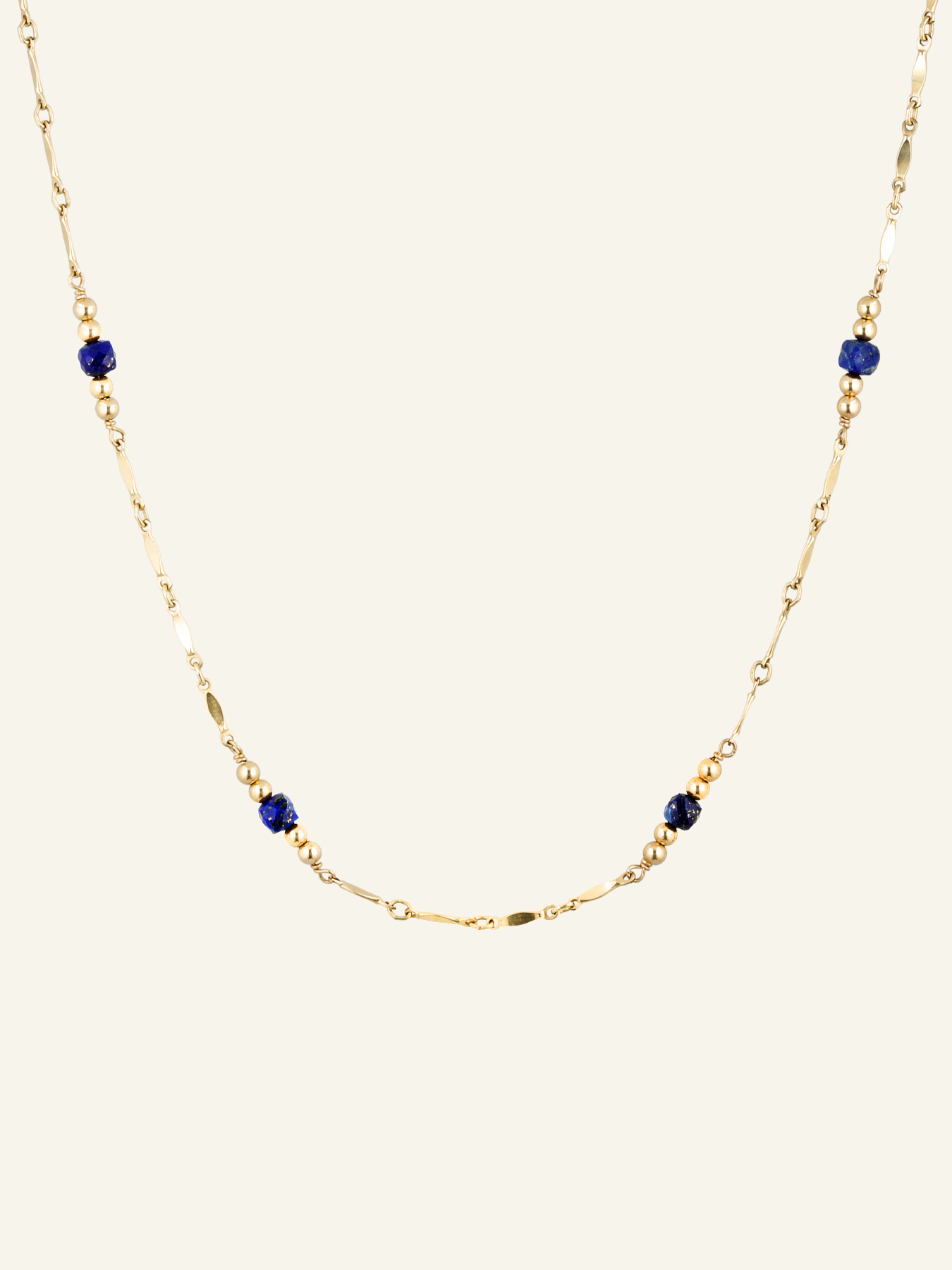 The Soleil Necklace features a bar chain with a repeated lapis and gold bead combination as a choker style necklace. The perfect chain to stack with our Azurine Necklace