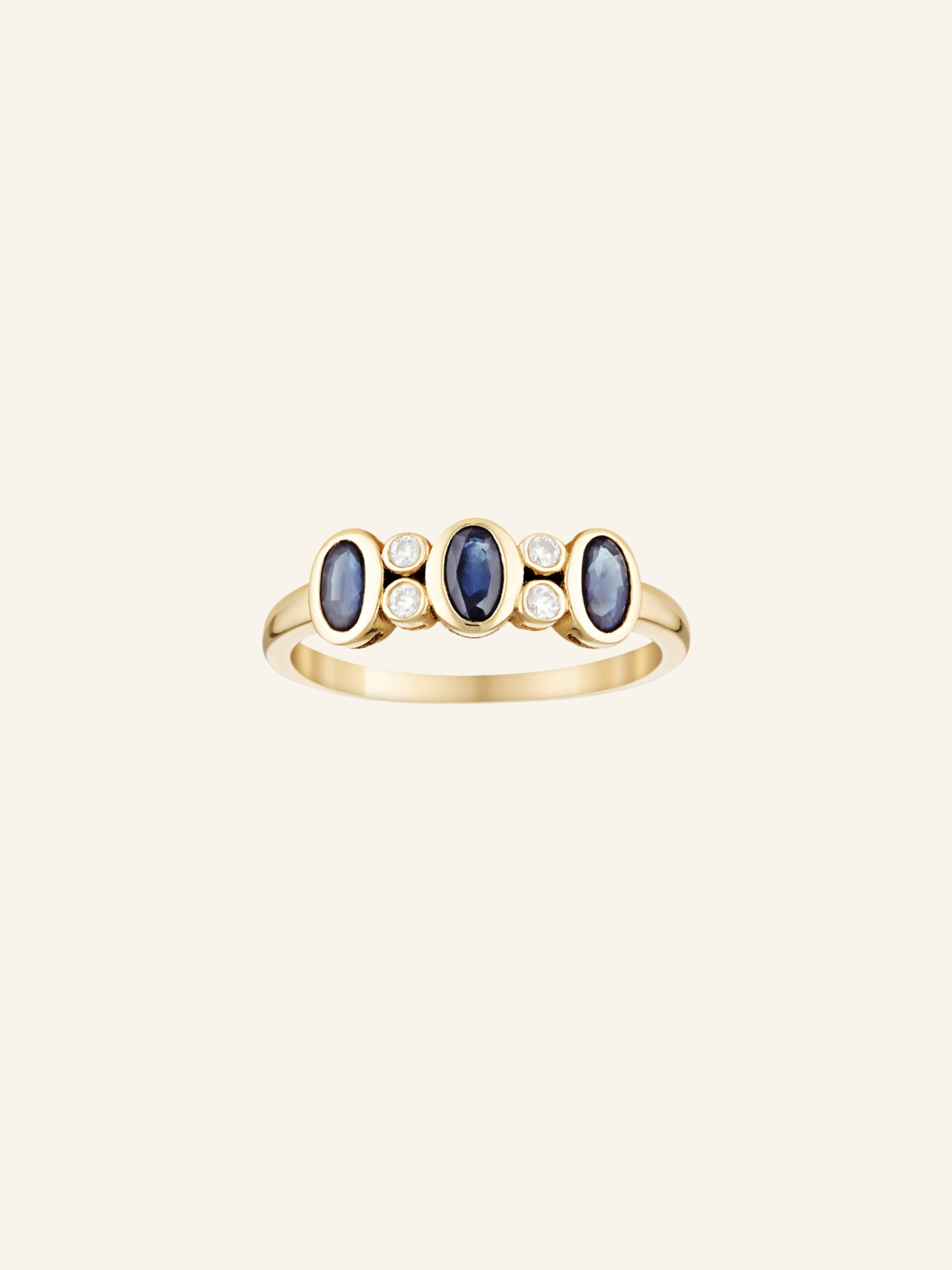 The Solid Gold Three Sapphire and Moissanite Ring features three oval Sapphire stones with, detailed with four circle moissanite stones in a vintage design ring.