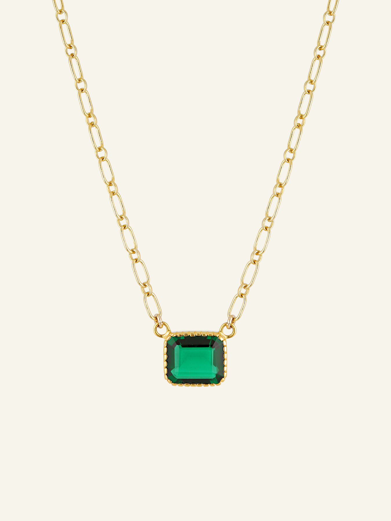 The Zoey Necklace features our Sachi chain with a drop down emerald pendant, the ultimate classic piece.